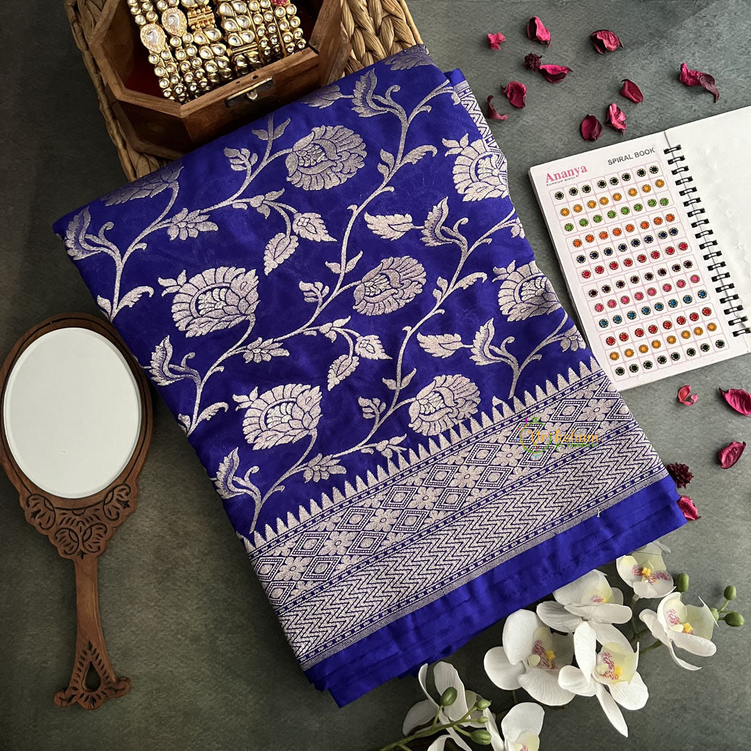 Indulge in the luxurious elegance of our Vriksham Ink Blue Katan Mashru Silk Banarasi Saree. Handwoven with the finest silk, this saree exudes sophistication and exclusivity. The intricate Banarasi weave adds a touch of artistry, making it a timeless addition to your wardrobe. Elevate your style with this premium handloom saree.