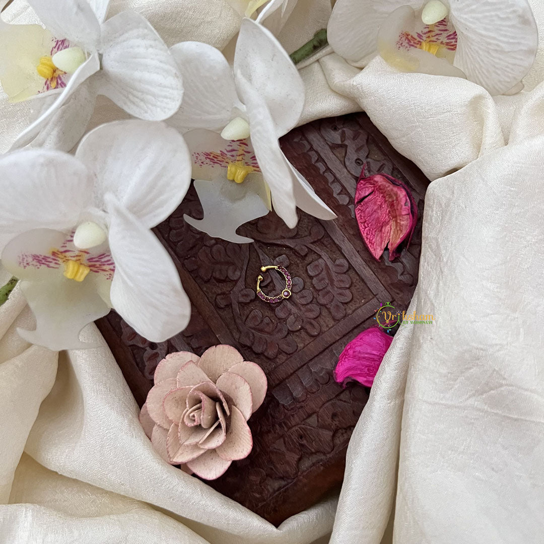 Elevate your style with the Vriksham Ira Gold-Plated Septum Ring, featuring vibrant red cubic zirconia accents. This finely crafted accessory offers a bold yet elegant statement, combining luxurious gold plating with sparkling detail for a refined look. Perfect for those seeking to enhance their ensemble with subtle sophistication.