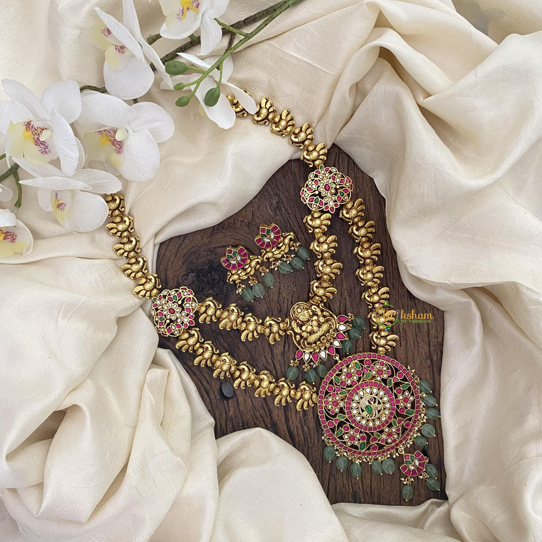 Enhance your style with Vriksham Jadau Kundan Layered Pendant Lakshmi Long Haram. This exquisite necklace features intricate Kundan work and a peacock design, representing beauty and grace. Elevate your look and channel your inner goddess with this timeless piece.