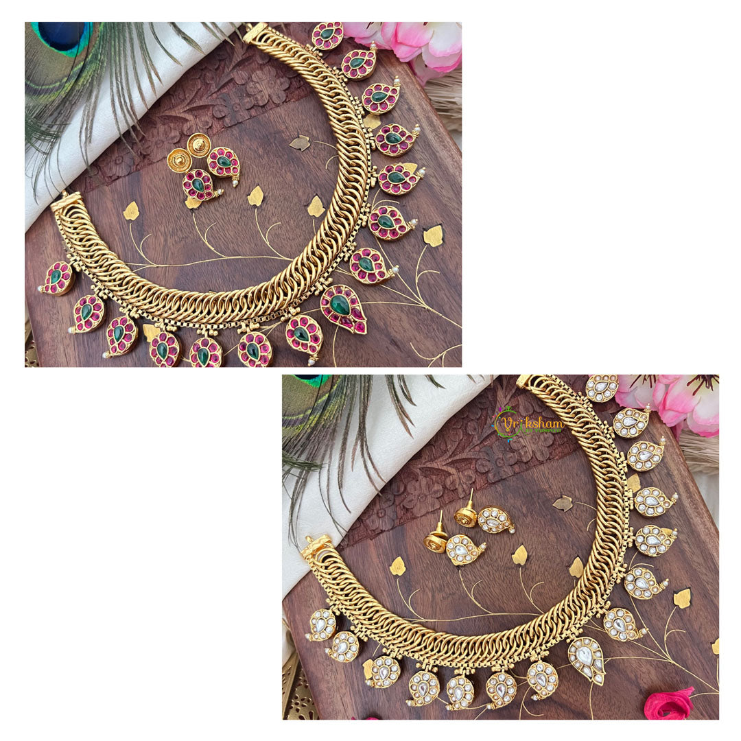 Introducing the Vriksham Jalebi Style Reversible Maanga Short Neckpiece, a luxurious and exclusive piece that will elevate any outfit. With its unique Jalebi style design and reversible feature, this neckpiece is truly one-of-a-kind. Add a touch of sophistication and elegance to your look with this stunning piece.
