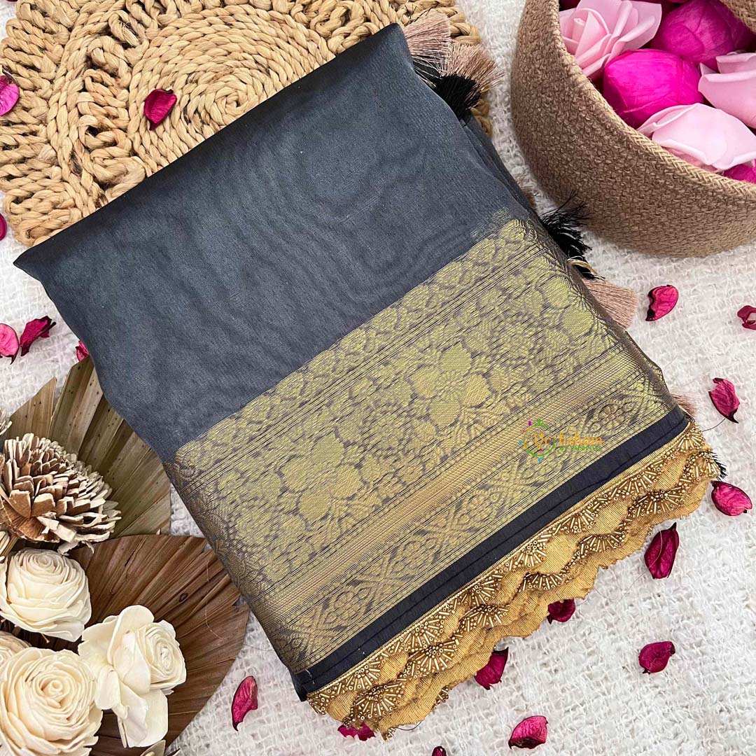 Discover refined elegance in this handloom organza saree, where minimalist aesthetics meet intricate artistry. The soft grey organza provides a versatile canvas that transitions seamlessly across occasions, while the aari work border showcases the precision of needle embroidery—a hallmark of traditional Indian craftsmanship. Each stitch reflects generations of weaving expertise, creating a garment that balances restraint with ornamental beauty. The delicate embroidered detailing adds dimension without overwhelming the design, perfect for those who appreciate subtle sophistication. A handcrafted treasure that celebrates cultural heritage while offering contemporary versatility for the discerning wardrobe.