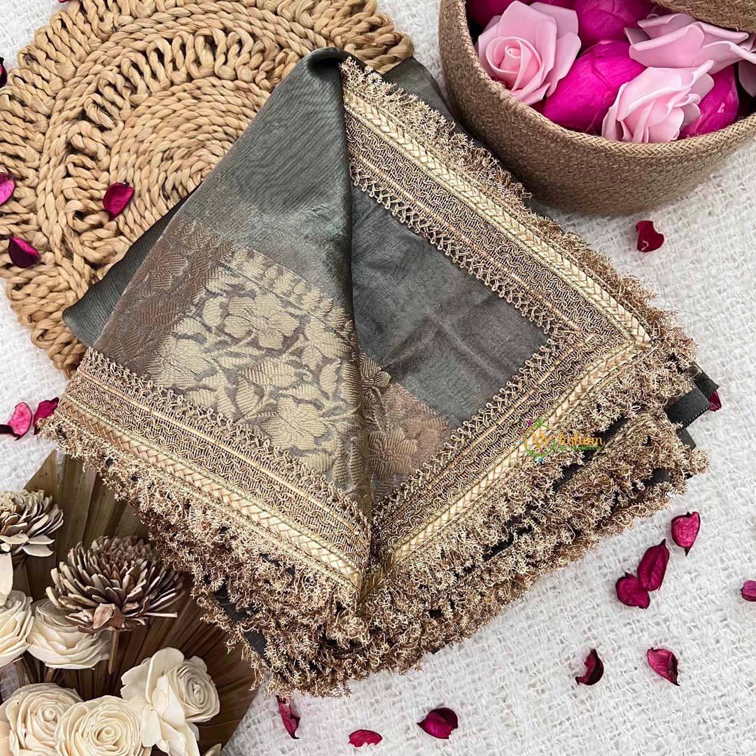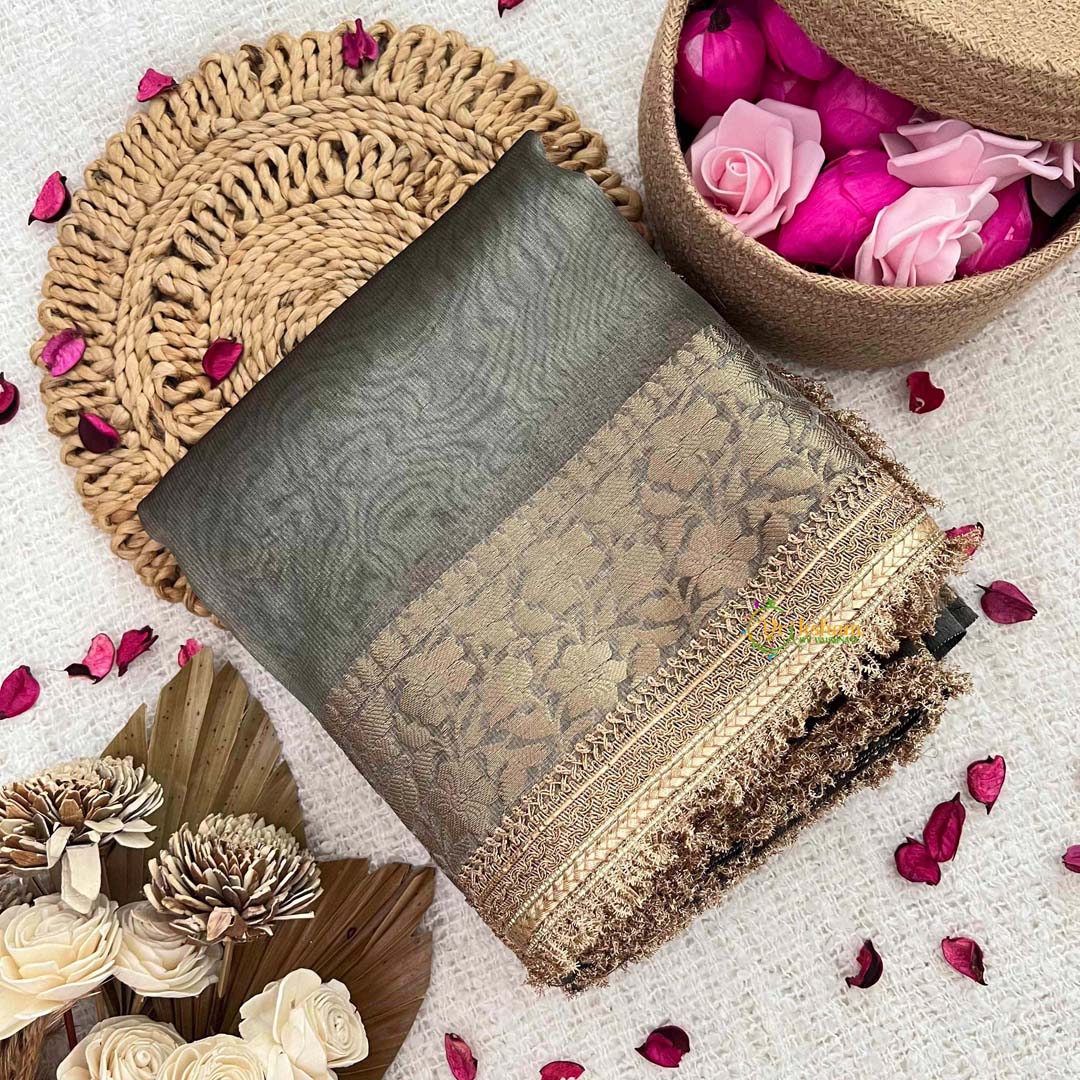 Exude contemporary elegance with this refined handloom organza saree, inspired by modern sophistication. The graceful grey fabric creates a neutral foundation that transcends seasons and occasions, while the delicate lace border introduces intricate detailing that elevates the overall aesthetic. Crafted through traditional handloom weaving, each saree carries the mark of artisanal excellence and meticulous attention to detail. The interplay of sheer organza and ornate lacework creates a harmonious balance between minimalism and embellishment. Ideal for the discerning individual who appreciates understated luxury and the enduring appeal of handcrafted textiles.
