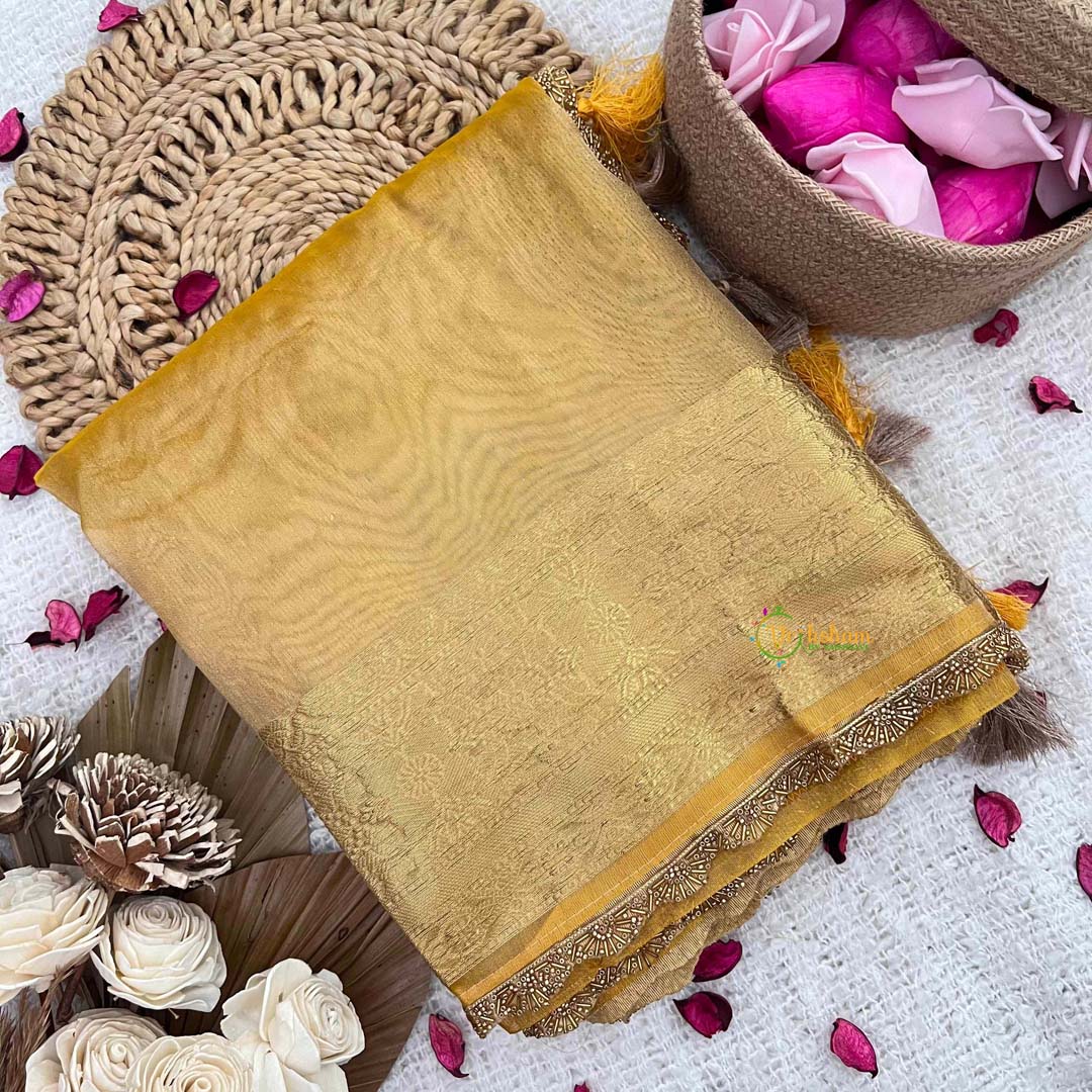 Indulge in luxury with our Mustard Yellow Organza Saree Aari Work Border. Handwoven and adorned with intricate details, this saree exudes elegance and sophistication. Crafted from premium quality fabric, it offers a smooth and comfortable fit. Elevate your wardrobe with this timeless piece, perfect for special occasions.