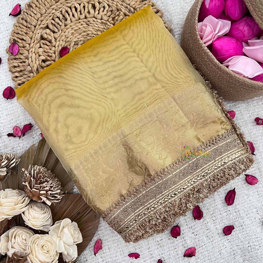 Indulge in luxury with our Mustard Yellow Organza Saree Lace Border. Handwoven and adorned with intricate details, this saree exudes elegance and sophistication. Crafted from premium quality fabric, it offers a smooth and comfortable fit. Elevate your wardrobe with this timeless piece, perfect for special occasions.