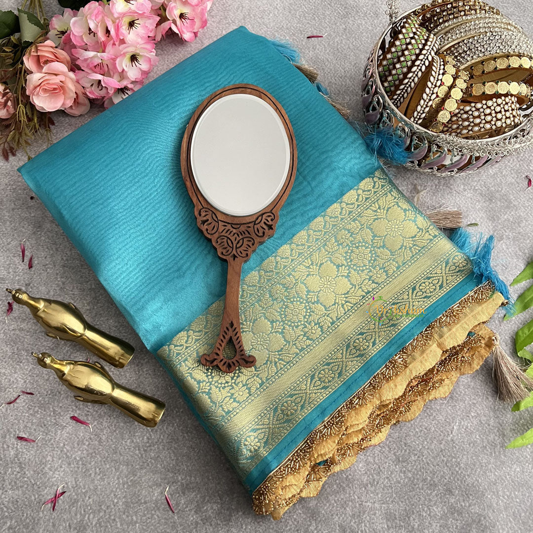 Indulge in luxury with our Sky Blue Organza Saree Aari Work Border. Handwoven and adorned with intricate details, this saree exudes elegance and sophistication. Crafted from premium quality fabric, it offers a smooth and comfortable fit. Elevate your wardrobe with this timeless piece, perfect for special occasions.