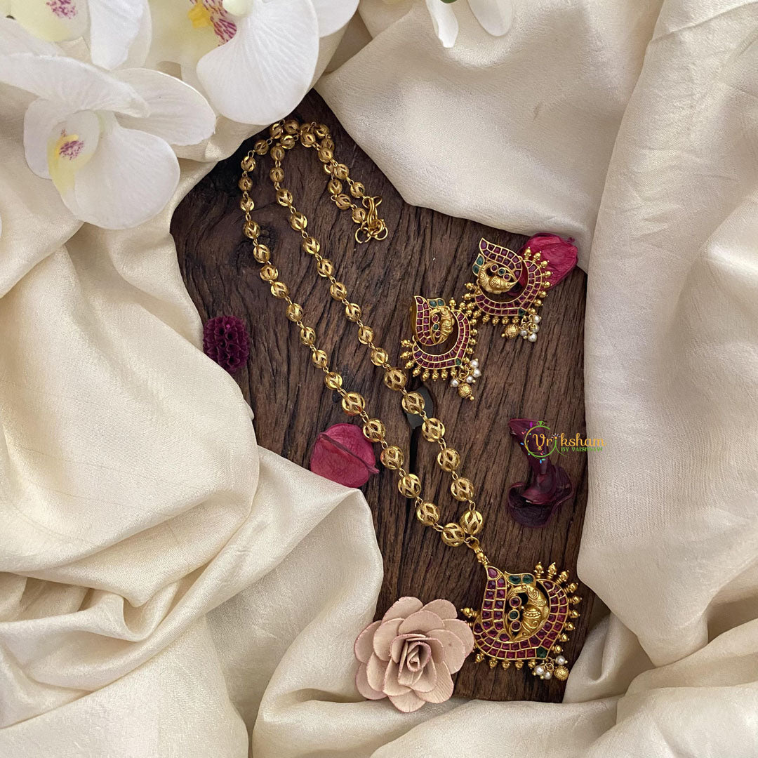 Kemp Peacock Pendant Neckpiece -Red Green stone studded, round gold like bead arranged neckpiece, comes with matching earrings.