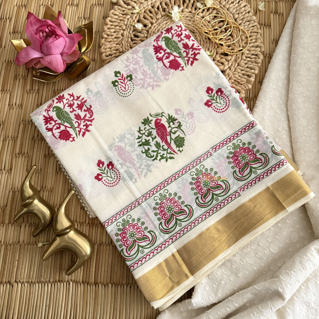 Embrace the classic charm of the Vriksham Kerala Kasavu Cotton Saree, featuring delicate parrot and floral motifs printed on soft, breathable cotton. This saree combines traditional Kerala kasavu elegance with nature-inspired designs, offering a refined and comfortable drape ideal for both casual and formal occasions. Its lightweight fabric ensures ease of wear while the intricate prints add a subtle yet sophisticated touch to your ensemble.