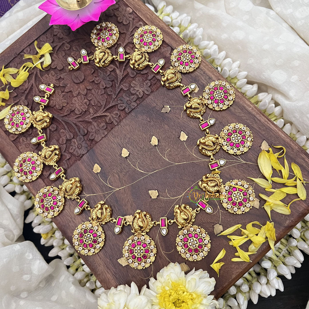 The Vriksham Kundan Jadau Coin Style with Peacock Neckpiece in red and white blends traditional artistry with regal allure. Featuring meticulously crafted kundan stones and jadau work, this neckpiece highlights a stunning peacock motif complemented by vibrant red and white accents. Its unique design adds a sophisticated touch to your festive and ceremonial attire.