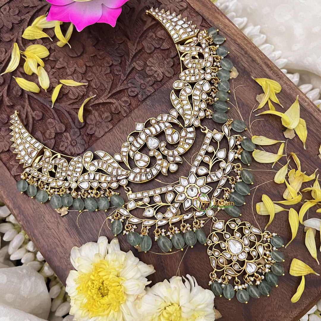 The Vriksham Kundan Jadau Layered Short Neckpiece offers a sophisticated fusion of traditional craftsmanship and contemporary design. Featuring intricate Kundan Jadau work layered with pastel green and white beads, this piece adds depth and elegance to any ensemble, making it an exquisite choice for refined occasions.