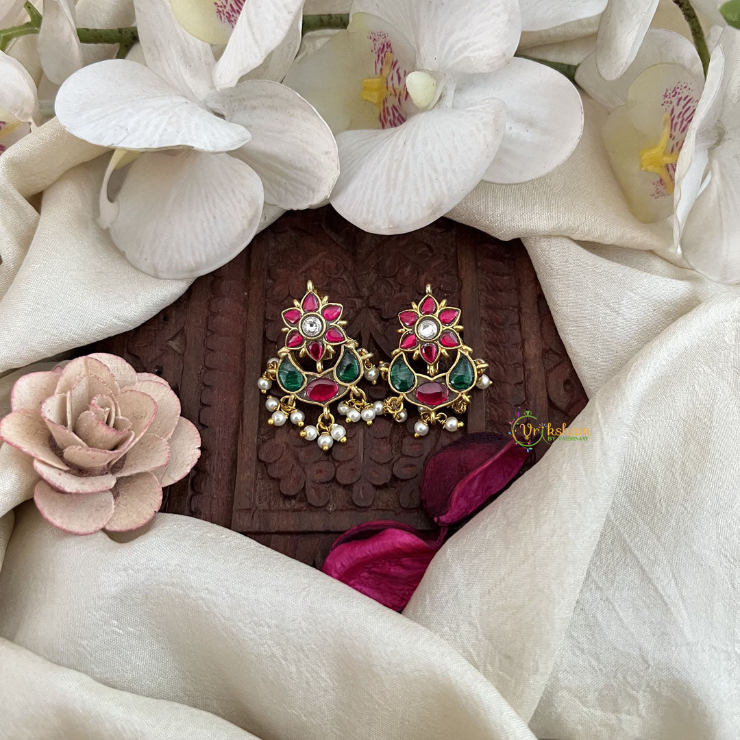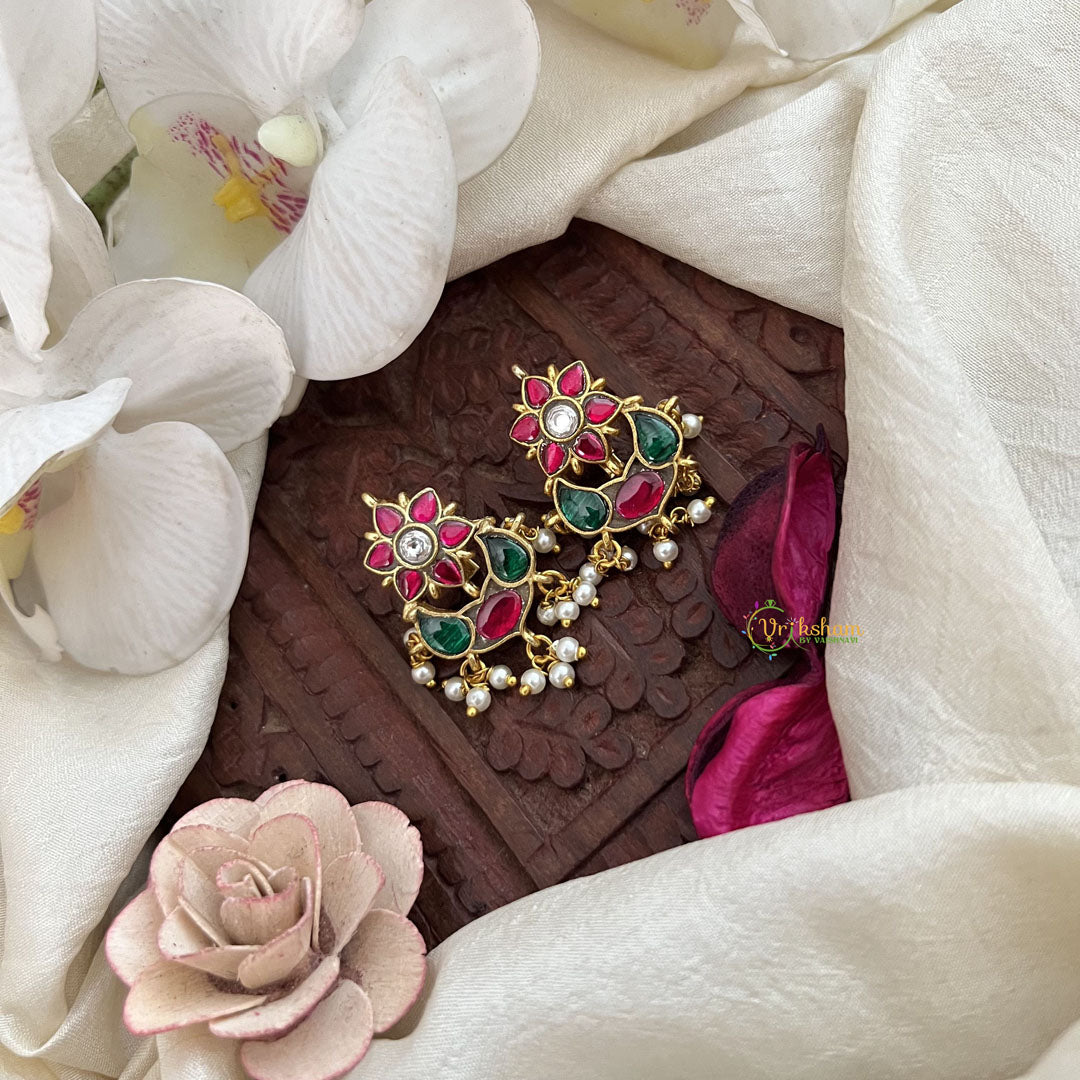 The Vriksham Kundan Phool & Maaga Style Jadau Press Bugadi in red, green, and white, accented with pearls, features an elegant fusion of floral and maaga motifs crafted with intricate kundan and jadau work. This sophisticated accessory adds a timeless and graceful charm to traditional attire, perfect for enhancing your look on special occasions with refined beauty.