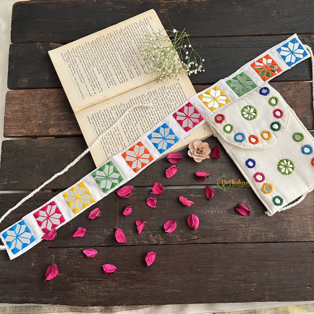 The Vriksham Kutch-Inspired Mirror Embroidery Mobile Pouch in white features exquisite mirror embroidery inspired by traditional Kutch craftsmanship. This sophisticated pouch combines cultural artistry with practical design, offering an elegant way to carry your essentials while enhancing your style with timeless ethnic charm.