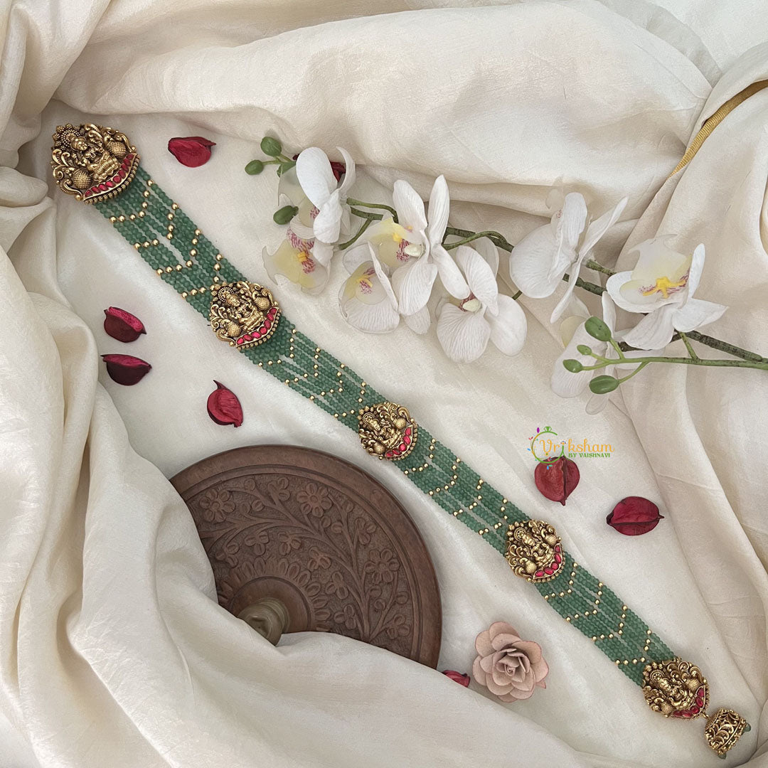 The Vriksham Lakshmi 7 Layer Green Beaded Jada Billai in Red combines vibrant red beads with traditional jhumka detailing, creating a striking bridal accessory. This sophisticated piece enhances your wedding look with its rich color and layered design, reflecting timeless elegance and cultural artistry. Ideal for brides who desire a refined and memorable adornment.