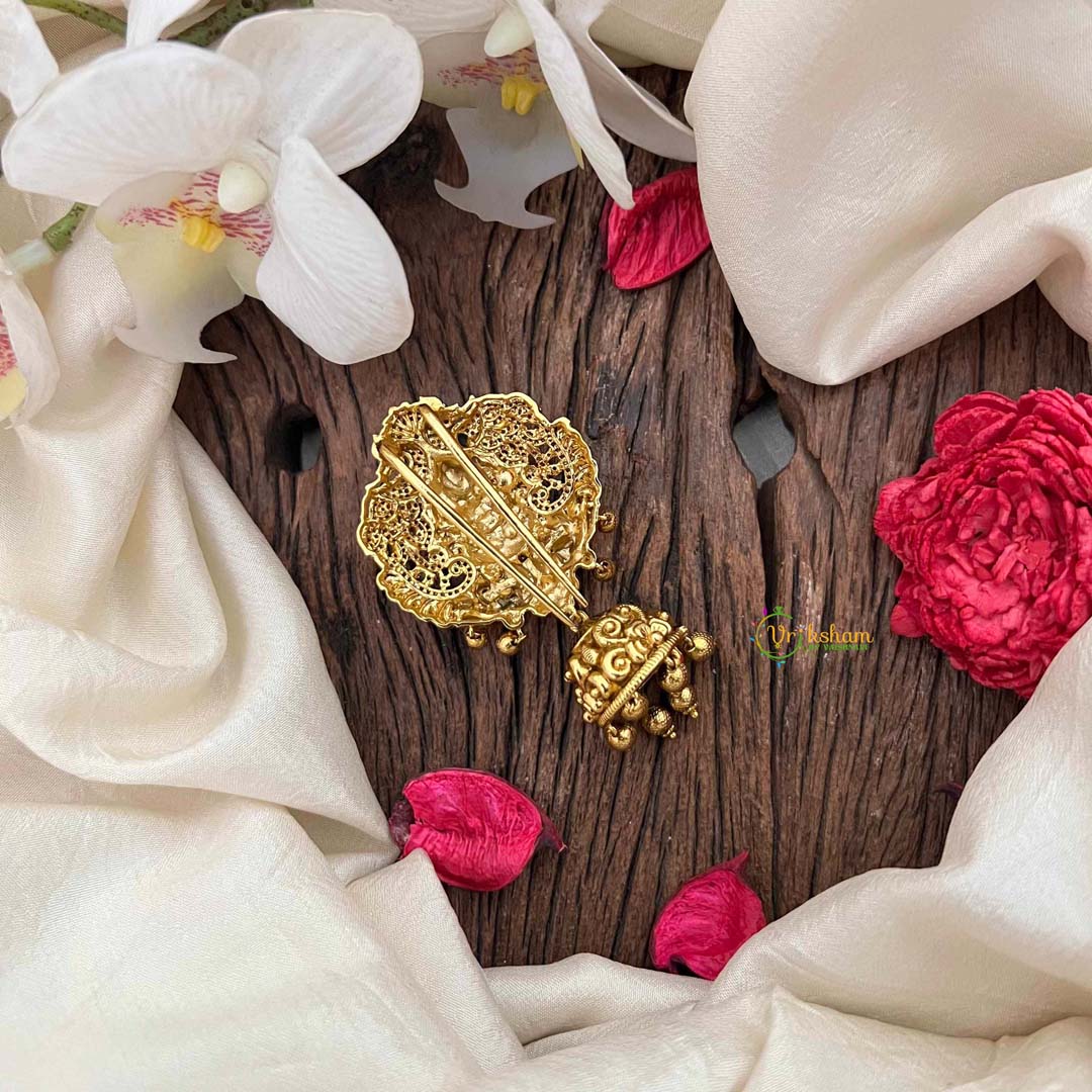 Celebrate abundance and prosperity with this enchanting Lakshmi-inspired jada billai, a tribute to divine grace and fortune. Adorned with brilliant AD stones that shimmer with captivating sparkle, this piece showcases a graceful jhumka design in verdant green tones, accented with warm gold beads. The sacred Lakshmi symbolism infuses this accessory with spiritual significance, making it an ideal choice for auspicious occasions and festive gatherings. The exquisite interplay between radiant AD stones and lustrous gold detailing creates an mesmerizing luminosity that enhances your ethnic ensemble with refined elegance and timeless cultural resonance.