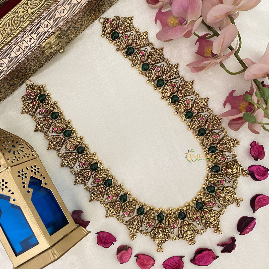 Indulge in the opulence of this Vriksham Lakshmi Coin With Peacock gold neckpiece. Adorned with a delicate green tear drop, this temple-inspired piece symbolizes prosperity and elegance. A 1 gm gold coin featuring the goddess Lakshmi adds a touch of divine beauty to this exclusive jewelry. Elevate your style with this luxurious statement piece.