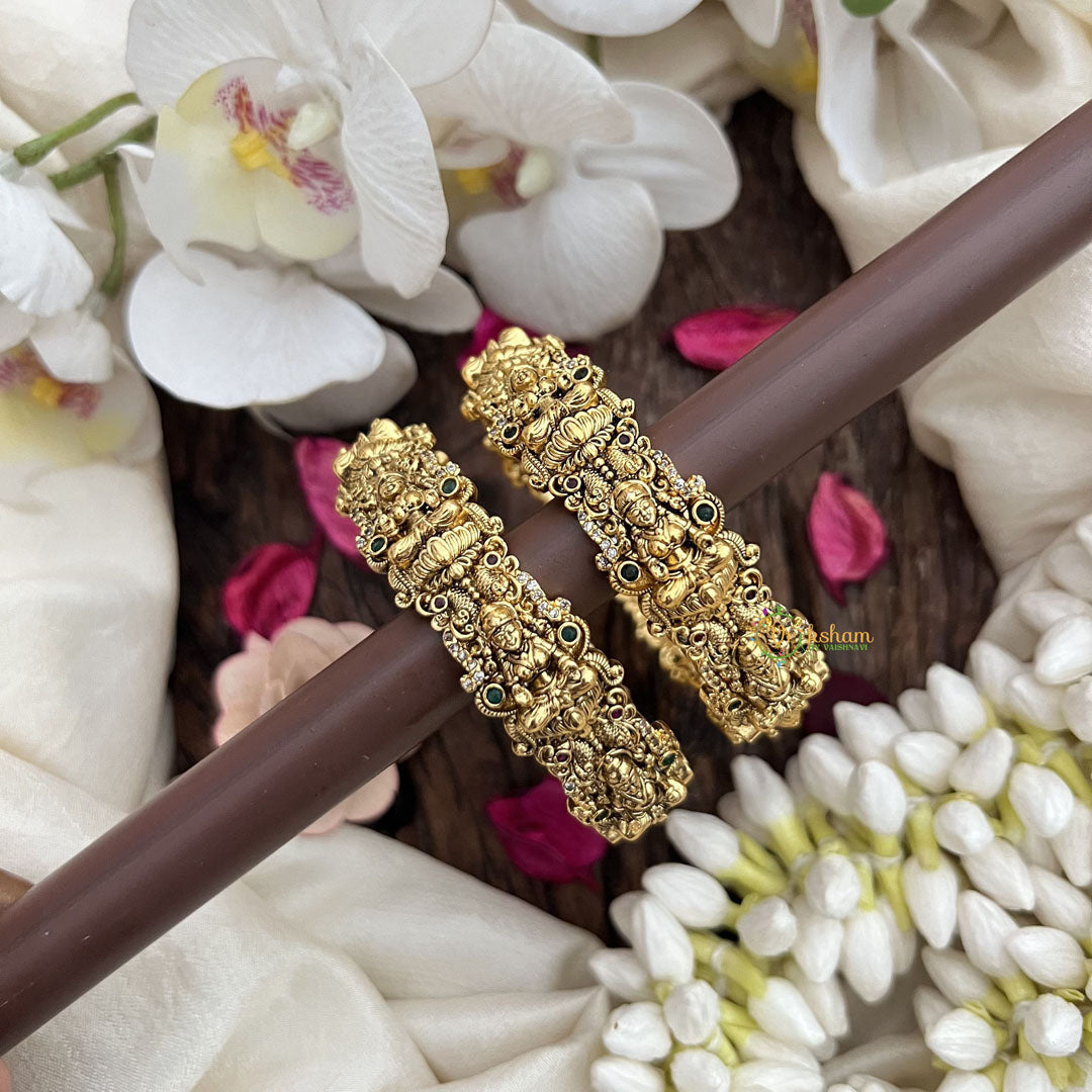 Elevate your traditional ensemble with the Vriksham Lakshmi Devi Temple Bangles in a refined green and white combination. Expertly crafted, these bangles showcase intricate temple-inspired motifs that symbolize prosperity and grace. Their elegant color palette and detailed design add a sophisticated touch, making them perfect for festive occasions or cultural celebrations. Experience timeless beauty and craftsmanship with every wear.