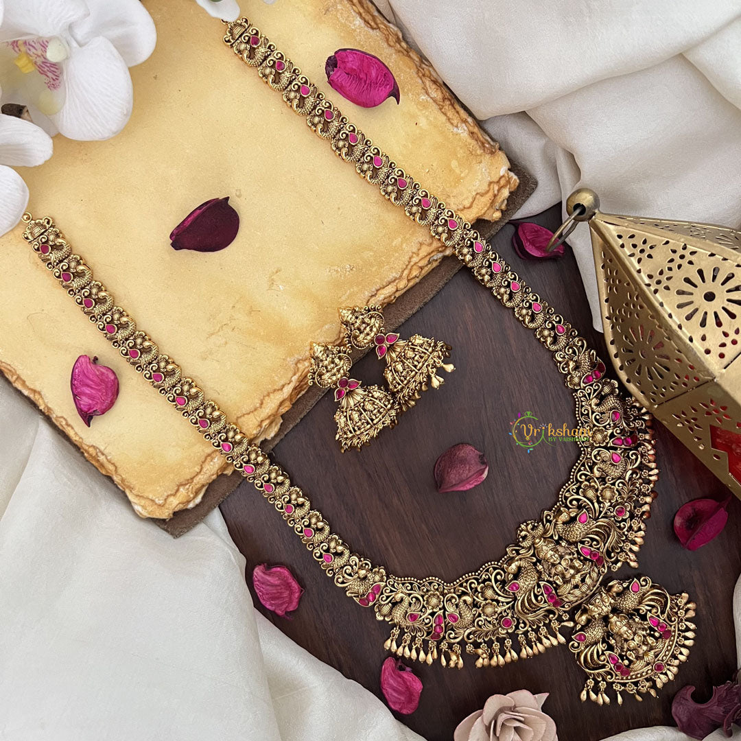 Indulge in elegance and luxury with our Vriksham Lakshmi Dual Peacock Pendant Long Neckpiece in vibrant red. Inspired by the majestic beauty of peacocks, this intricate pendant is a symbol of prosperity and grace. Elevate any outfit with its dual peacock design and make a statement that is truly unique.