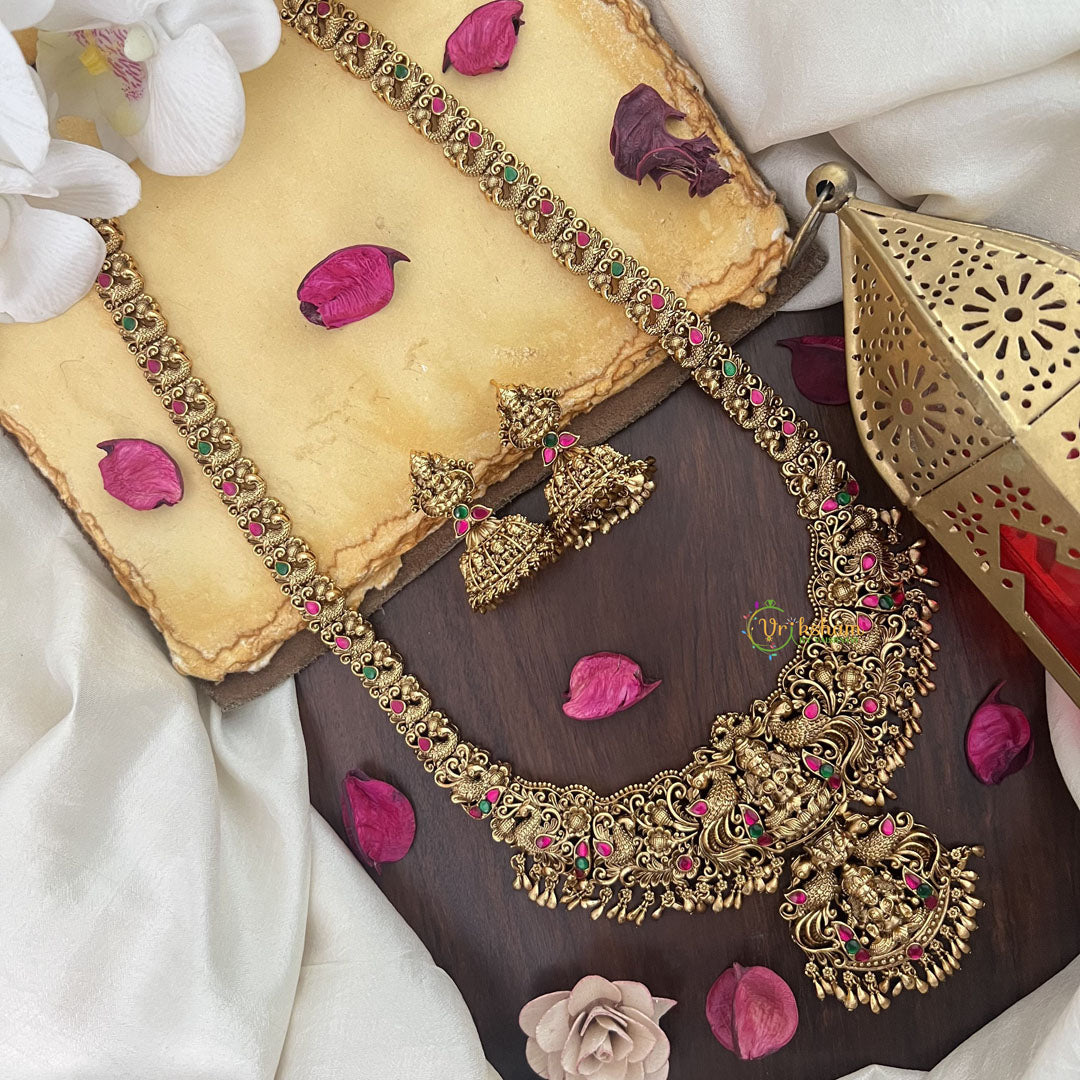 Indulge in elegance and luxury with our Vriksham Lakshmi Dual Peacock Pendant Long Neckpiece in vibrant red green. Inspired by the majestic beauty of peacocks, this intricate pendant is a symbol of prosperity and grace. Elevate any outfit with its dual peacock design and make a statement that is truly unique.