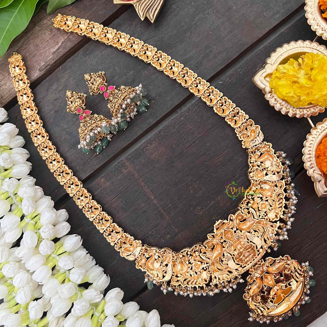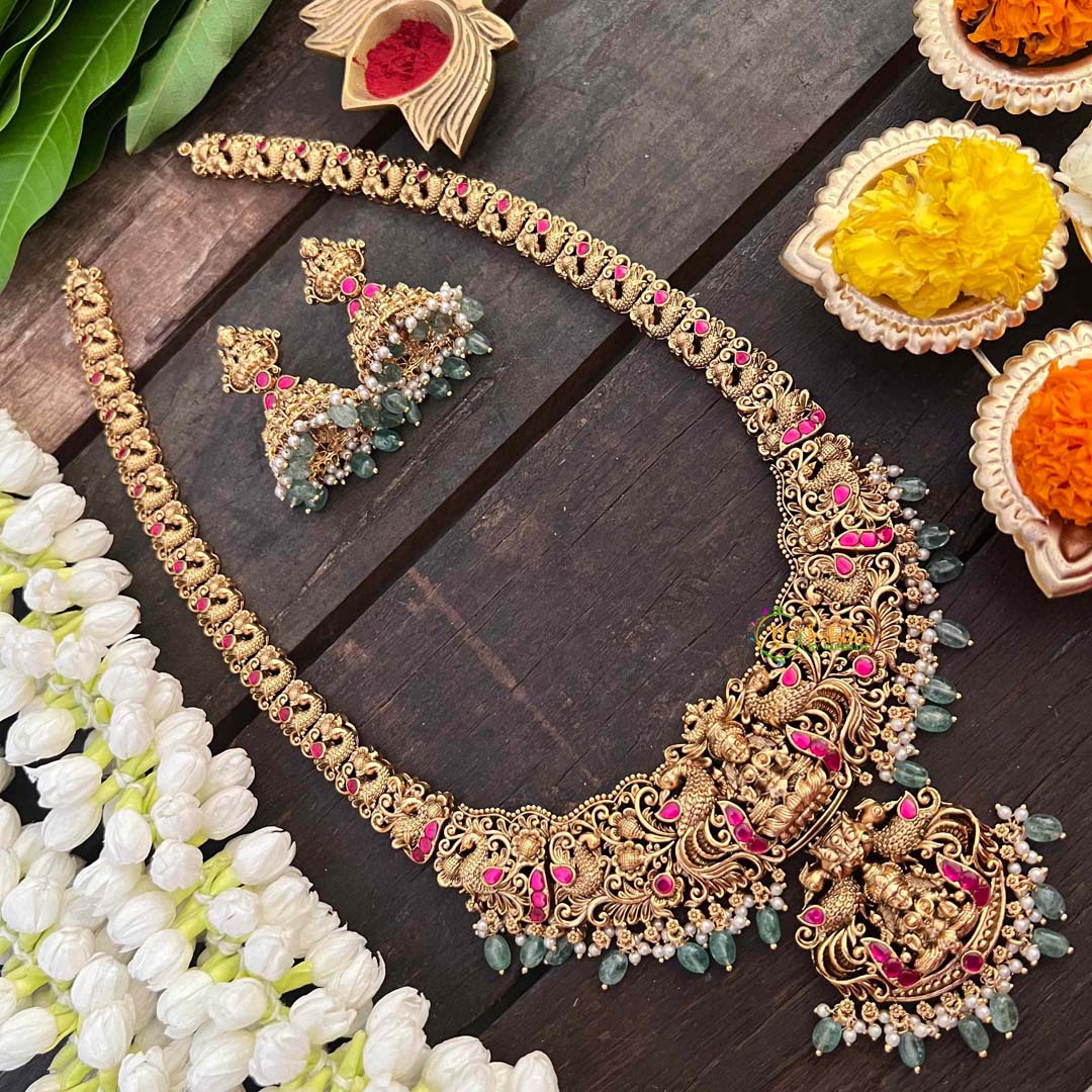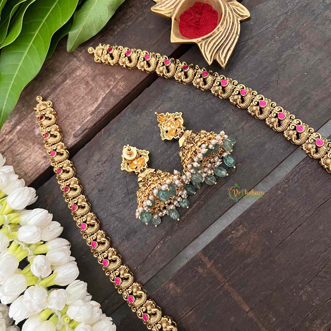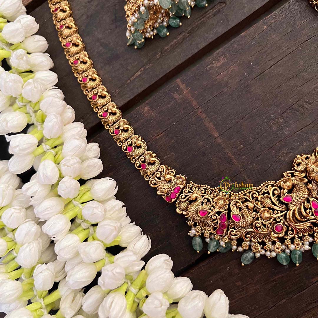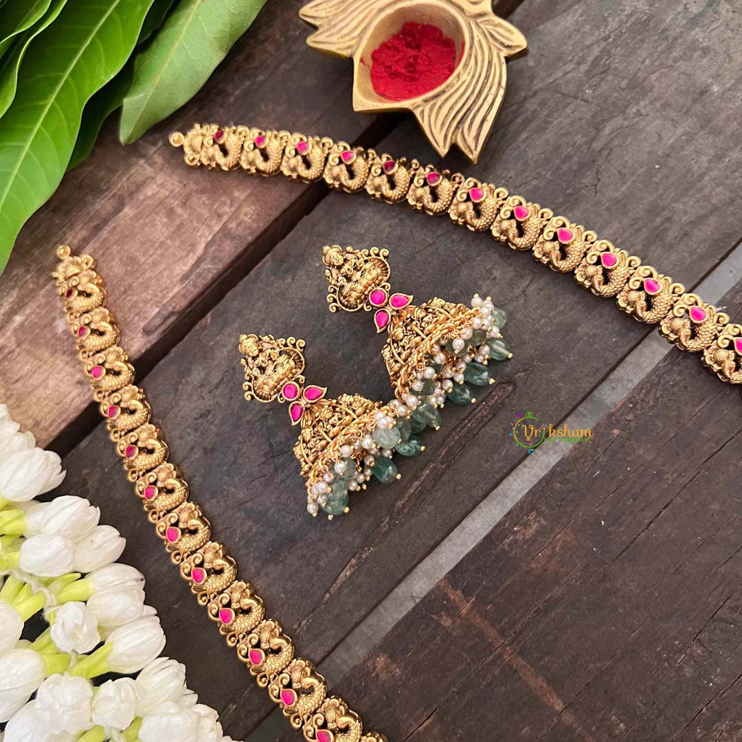 This exquisite neckpiece showcases a unique combination of red and pastel green beads, adorned with a Vriksham Lakshmi dual peacock pendant. With its intricate design and luxurious feel, this necklace is a must-have for those who appreciate elegance and sophistication. Elevate your style with this stunning piece.