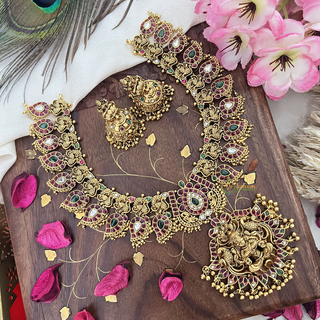 Embrace elegance and grace with the Vriksham Lakshmi Dual Peacock Pendant Maanga Short Neckpiece. This stunning piece features intricate peacock pendants, adorned with vibrant red and gold beads. Elevate any outfit with this luxurious and exclusive necklace.