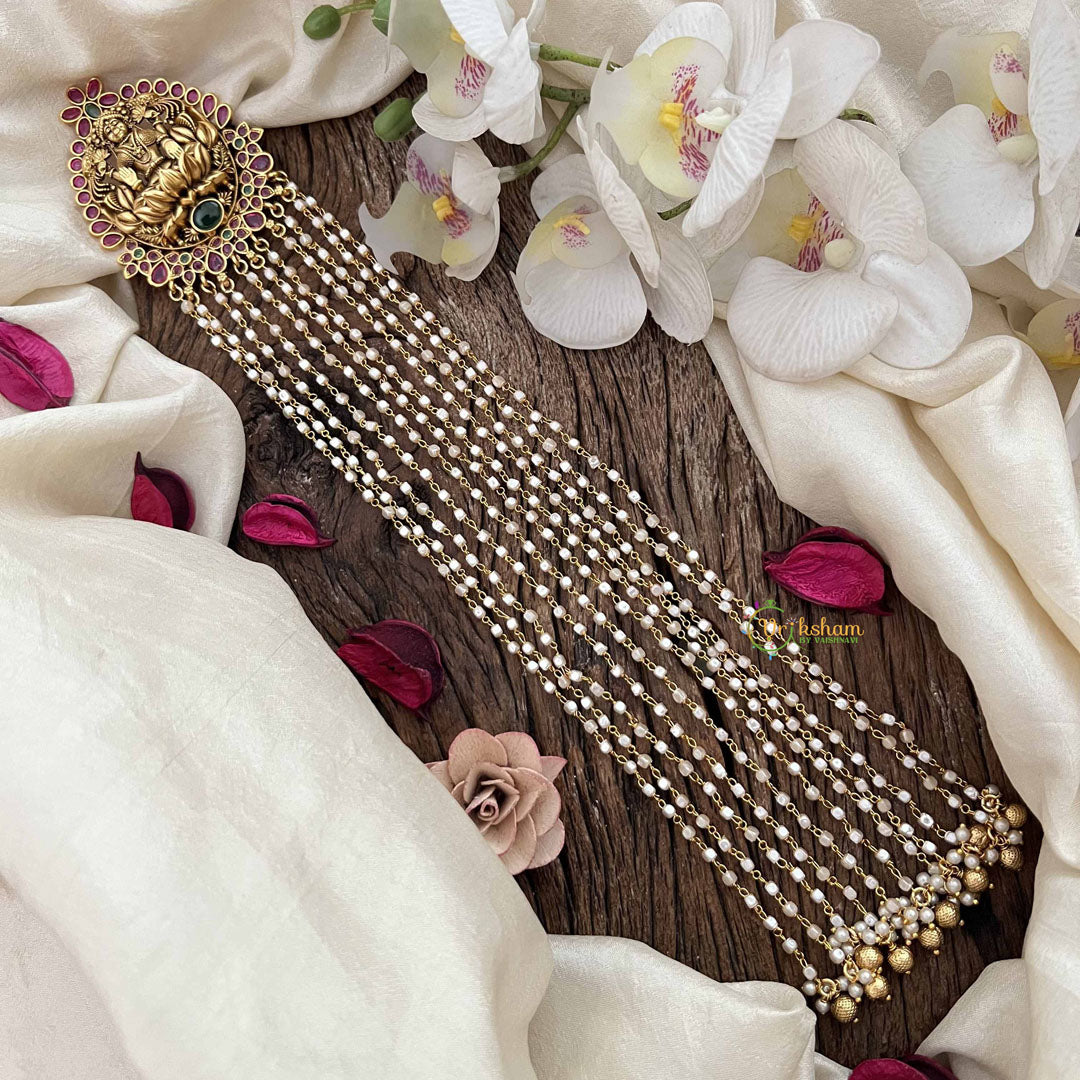 The Vriksham Lakshmi Idol with Floral Design Jada Billai features an intricate depiction of the Lakshmi idol surrounded by delicate floral patterns, adorned with red and green stones. Enhanced by a graceful pearls line drop, this sophisticated accessory adds spiritual elegance and timeless beauty to traditional hairstyles, perfect for festive and ceremonial occasions.