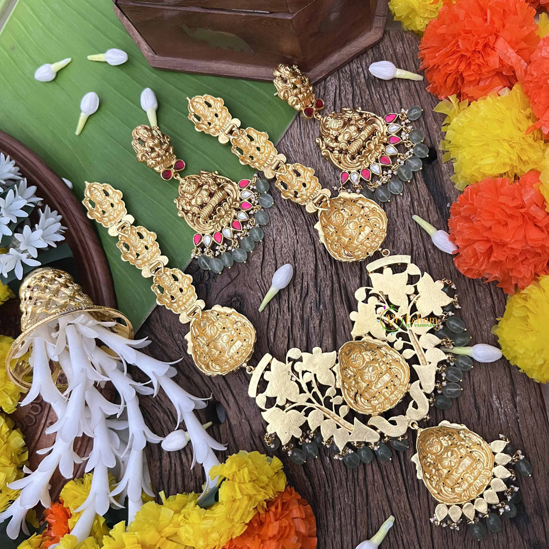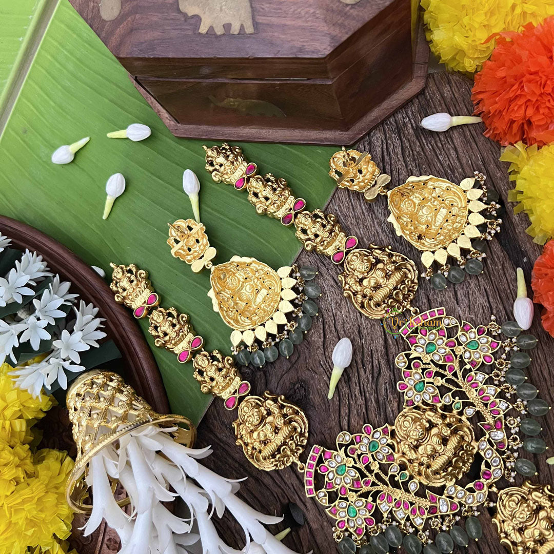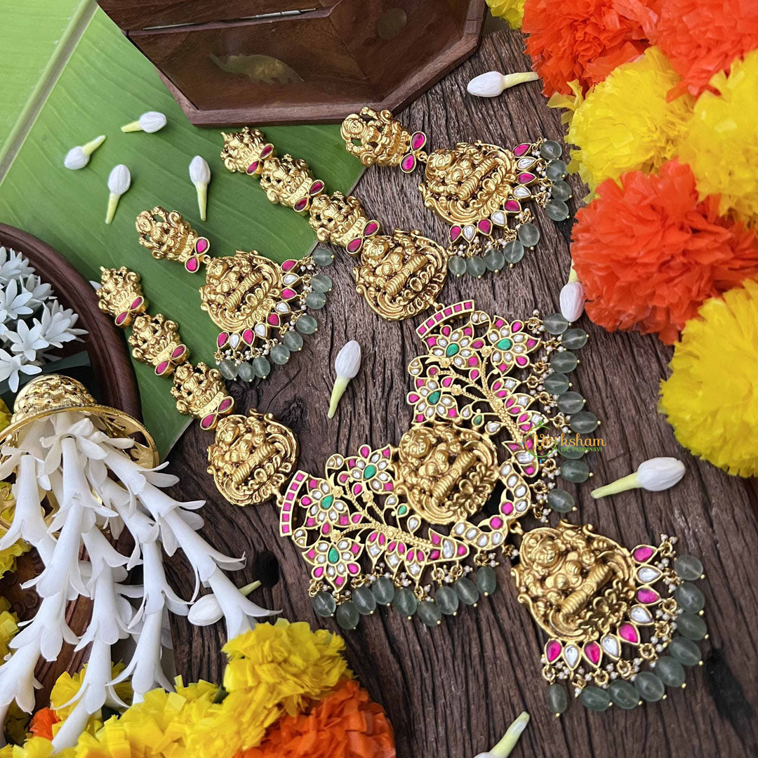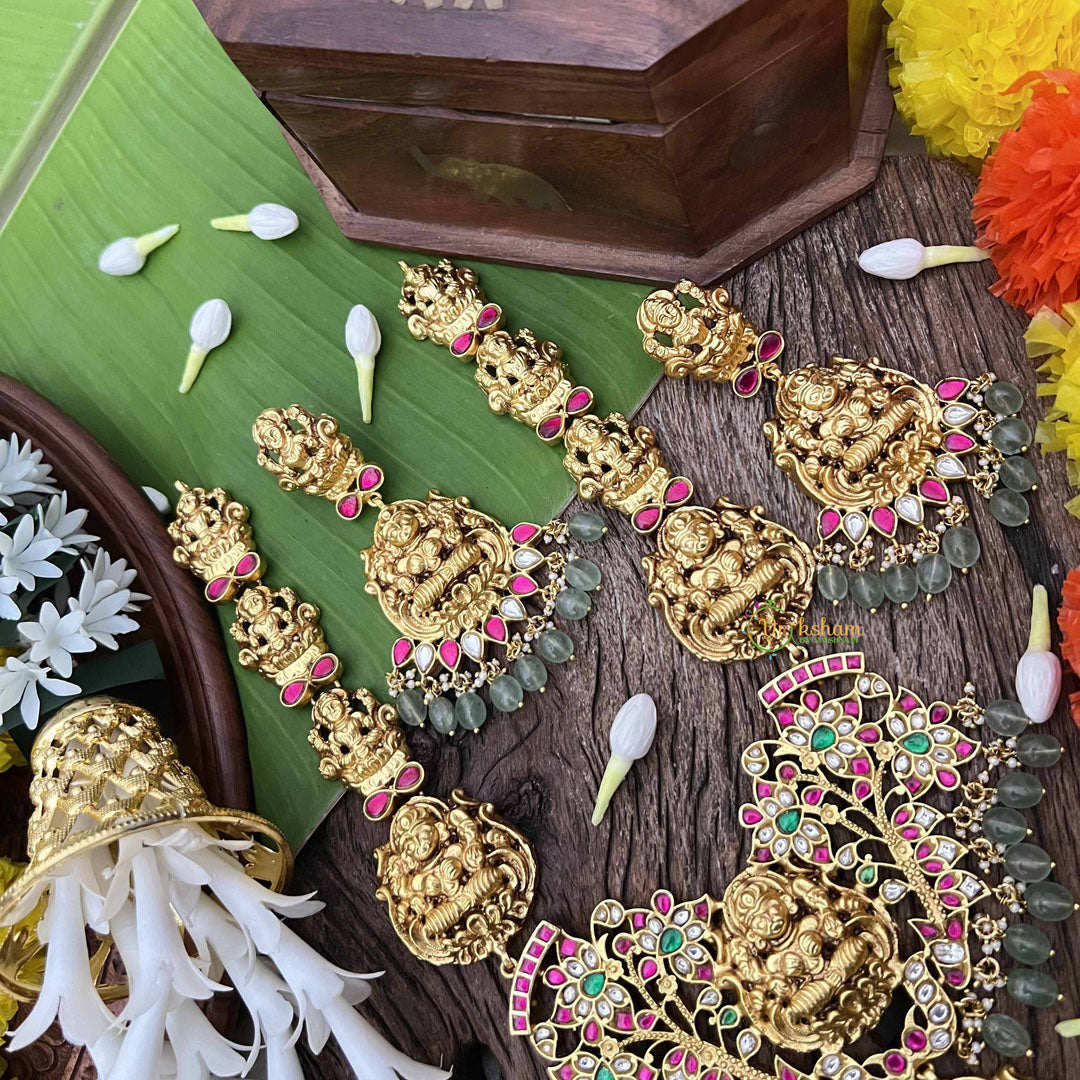 Invoke divine blessings with this exquisite Lakshmi Idol long neckpiece, a profound fusion of spirituality and artisanal excellence. The sacred Lakshmi pendant, adorned with intricate floral Kundan Jadau work, radiates prosperity and grace. Complemented by a harmonious palette of rich red, verdant green, and pristine white stones interspersed with elegant green beads, this piece transcends mere adornment. Perfect for spiritual seekers and tradition-conscious individuals, it serves as both a devotional symbol and a statement of refined taste, making it an heirloom treasure worthy of cherished moments and sacred celebrations.
