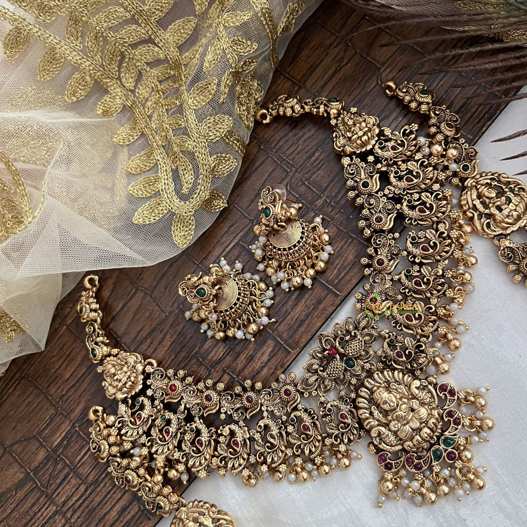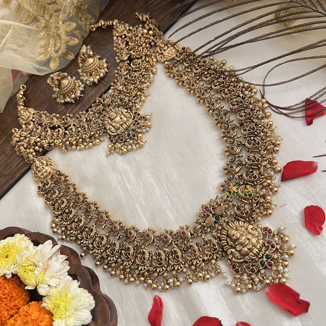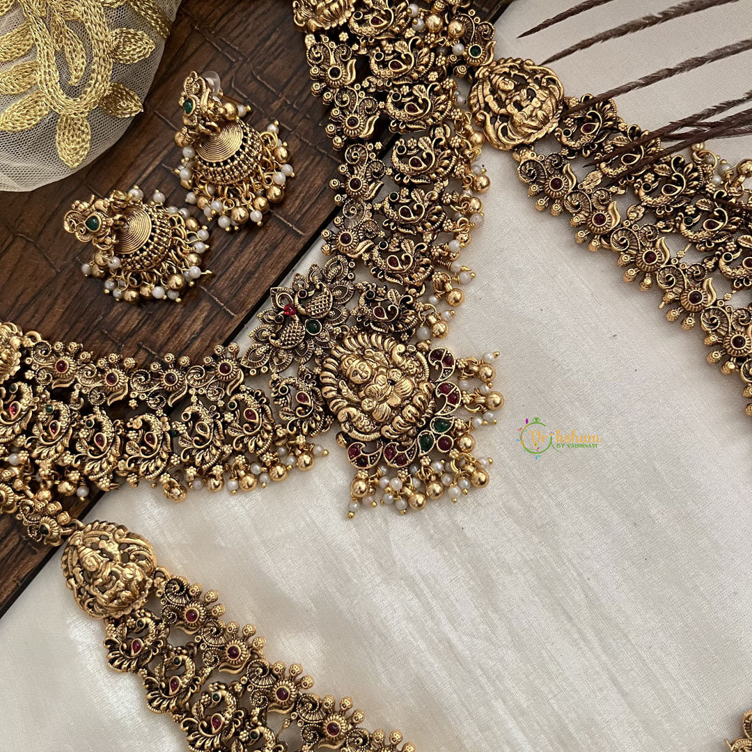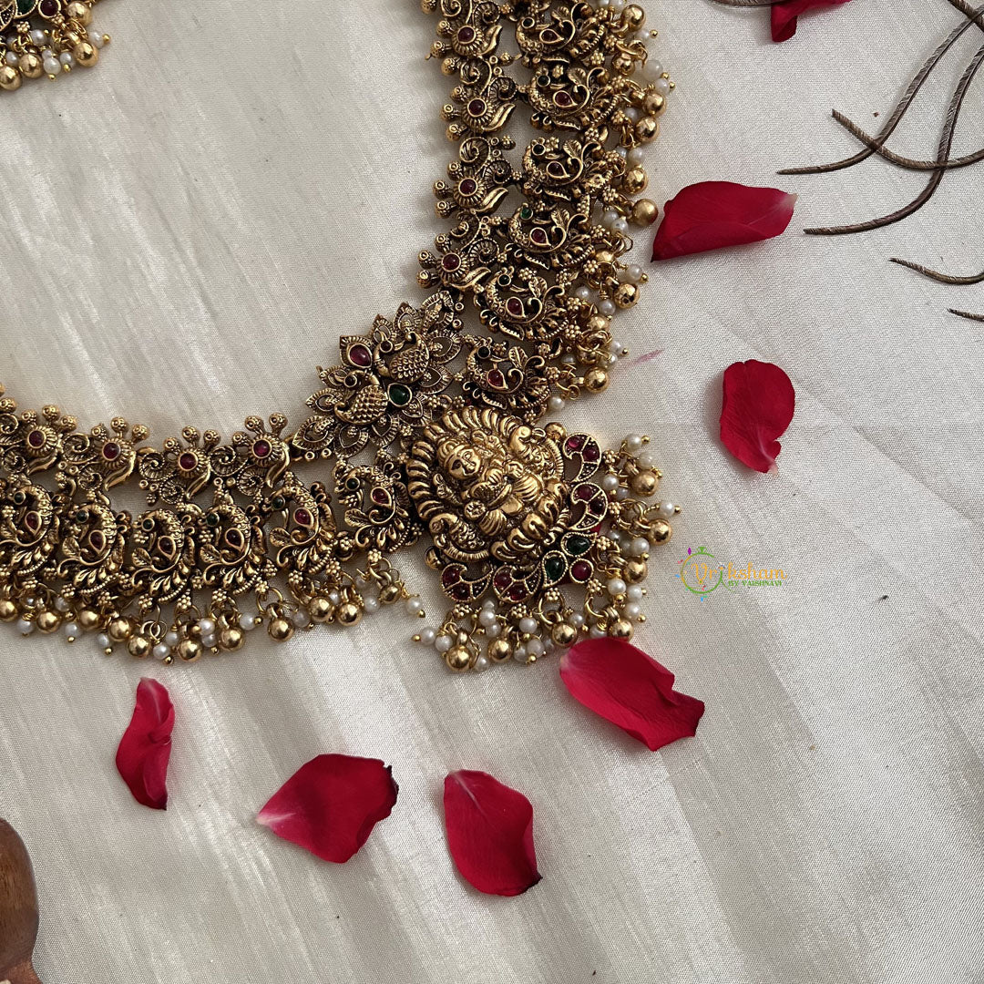 The Vriksham Lakshmi Mayura Antique & Lotus Floral Temple Bridal Set in Green, Red, and Pearl embodies refined elegance with its antique finish and detailed artistry. Showcasing traditional Lakshmi and peacock motifs alongside lotus floral temple designs, this set is enriched with vibrant green and red accents and delicate pearls. It offers a sophisticated fusion of heritage and grace, ideal for brides seeking a timeless and distinguished look on their wedding day.