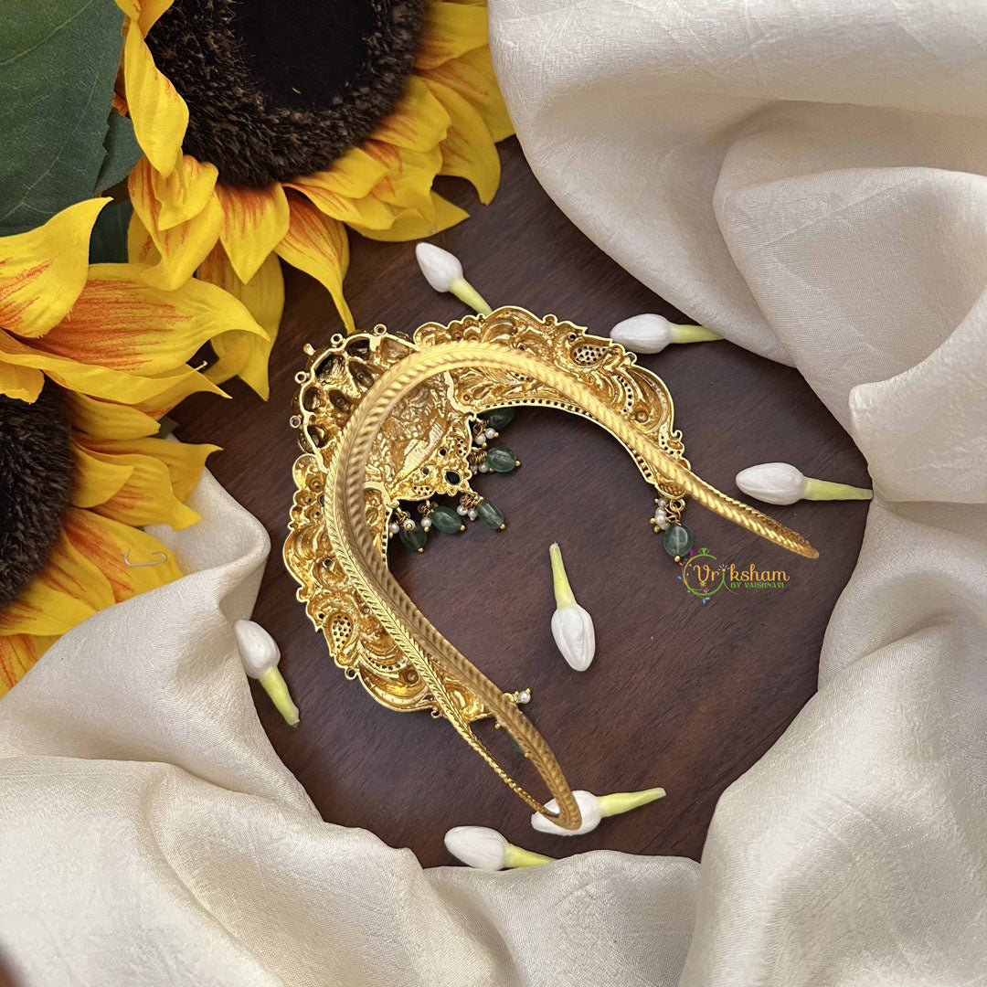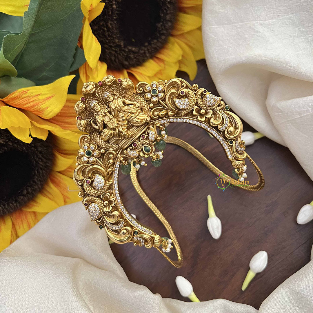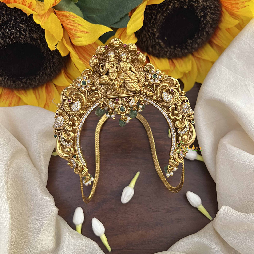 Revere divine union with this Lakshmi Narayan Idol Vangi Temple Armlet, celebrating the sacred partnership of Goddess Lakshmi and Lord Vishnu in harmonious devotion. The intricate idol work captures their benevolent presence with meticulous craftsmanship rooted in temple jewelry traditions. Adorned with vibrant green beads that symbolize prosperity, growth, and auspiciousness, this armlet radiates spiritual significance and refined elegance. The harmonious blend of divine masculine and feminine energies creates a powerful spiritual talisman for those honoring this sacred union. Crafted with devotional reverence and artistic excellence, this temple piece serves as a meaningful companion for daily spiritual practice or significant religious celebrations. Perfect for those devoted to Lakshmi Narayan worship and seeking to deepen their spiritual connection, this sophisticated armlet seamlessly merges cultural authenticity with contemporary refinement. An invaluable treasure that honors sacred traditions while making a graceful statement of faith and devotion, enriching your jewelry collection with timeless spiritual significance.