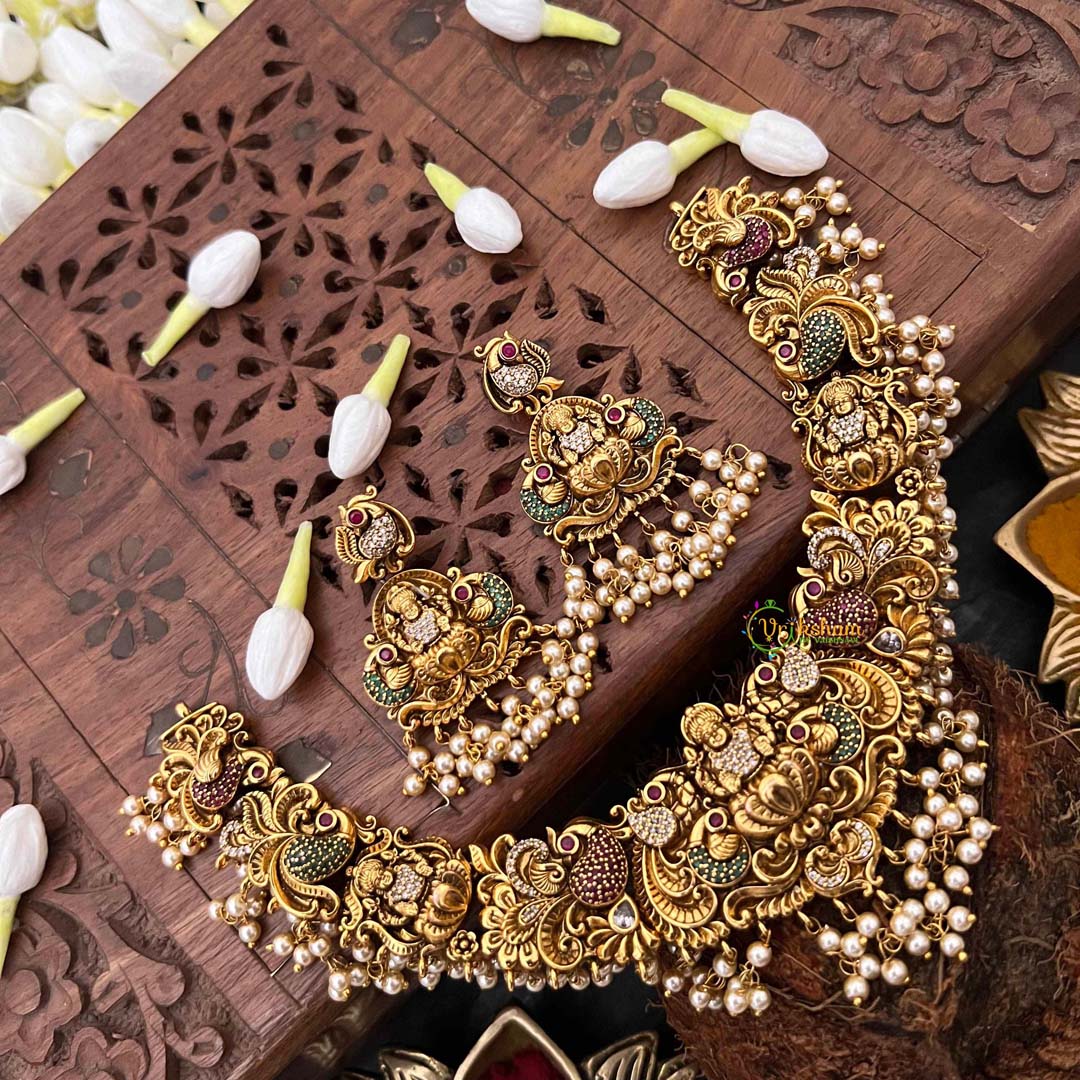 Behold divine elegance with this captivating short neckpiece, where goddess Lakshmi and peacock imagery converge in a symphony of color and light. Brilliant diamonds punctuate the composition, while rich red and verdant green hues evoke prosperity and vitality. Lustrous pearls add ethereal refinement, creating a multi-dimensional piece that celebrates both spiritual significance and aesthetic brilliance. Crafted with meticulous attention to detail, this neckpiece seamlessly transitions from festive celebrations to auspicious ceremonies. A sophisticated treasure that honors traditional iconography while radiating contemporary allure—an heirloom-worthy investment in timeless Indian artistry.