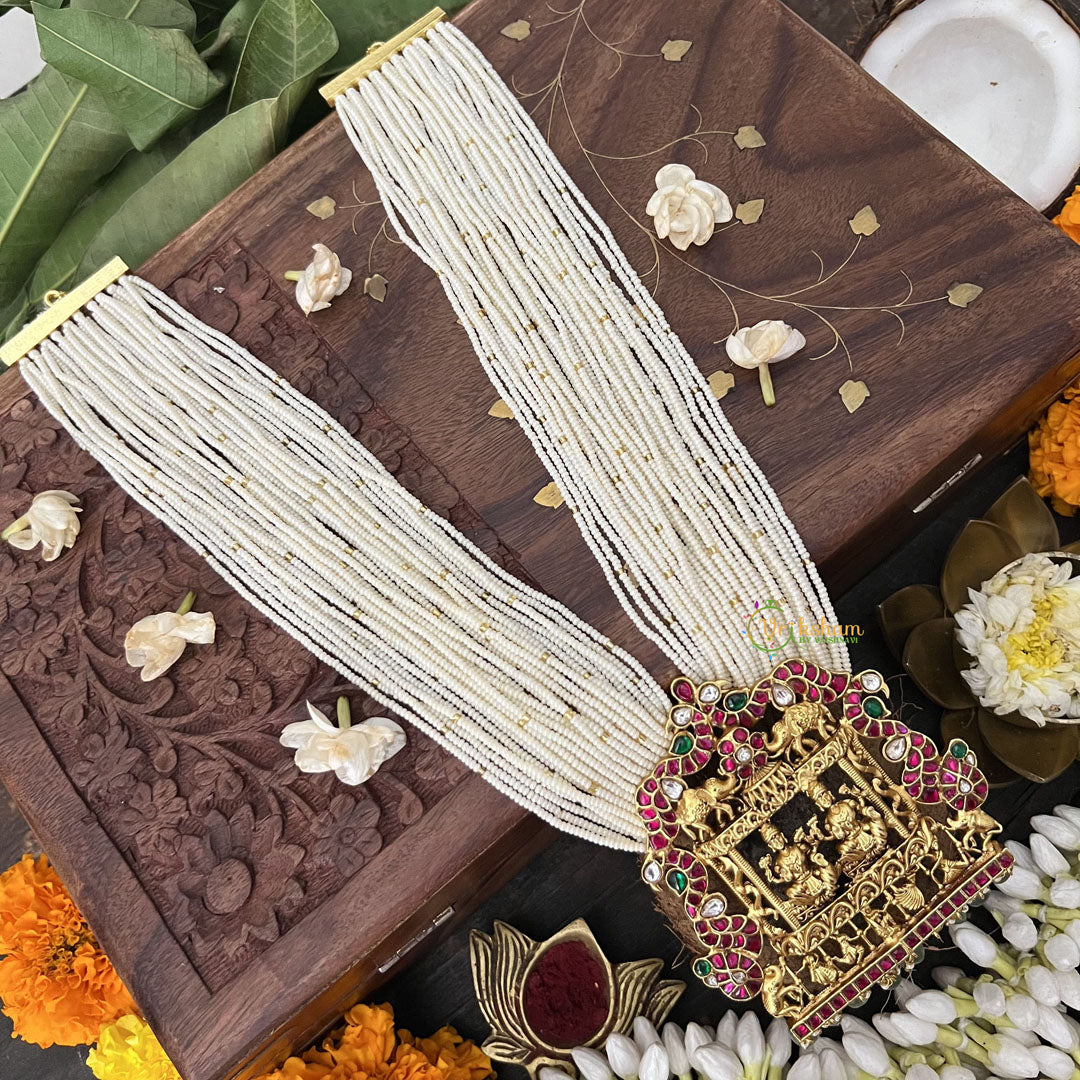 The Vriksham Lakshmi Pendant 10 Layer Pearl Beaded Maala Neckpiece features ten elegant strands of pearls accented with aqua green beads. Centered by a finely detailed Lakshmi pendant, this sophisticated piece blends classic beauty with spiritual significance, making it an exquisite choice for special occasions.
