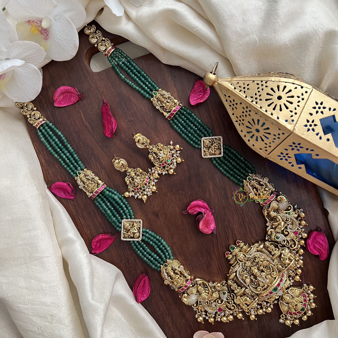 Vriksham Lakshmi Pendant Green Beaded Mala Jadau Long Neckpiece-Gold Bead-J2998