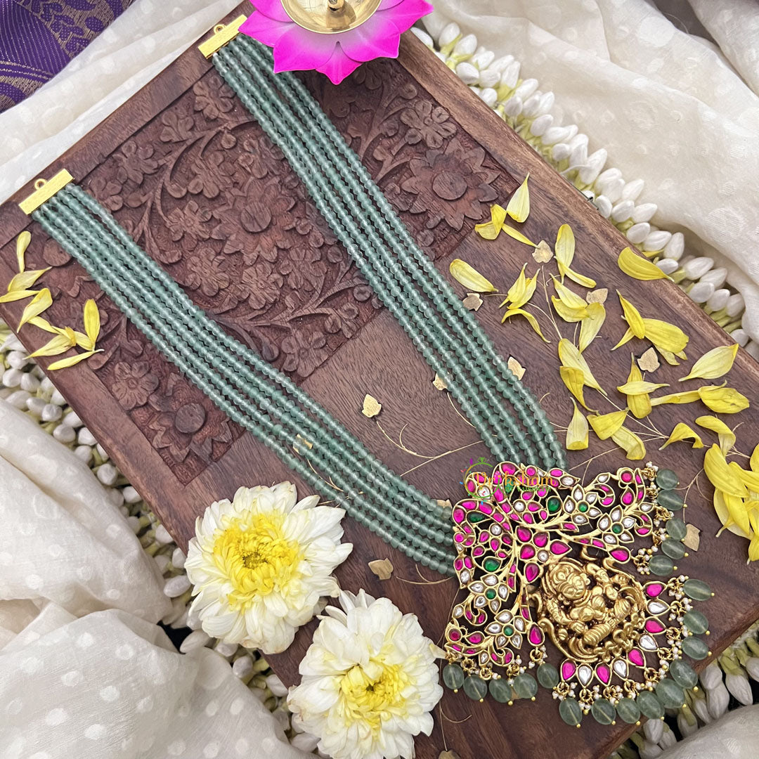 The Vriksham Lakshmi Pendant Jadau Kundan 5 Layer Green Beaded Maala Neckpiece features intricate kundan and jadau craftsmanship showcasing a beautifully detailed Lakshmi pendant. With five layers of elegant green beads, this maala offers a stately and sophisticated silhouette, perfect for enhancing traditional attire with depth and grace on special occasions.