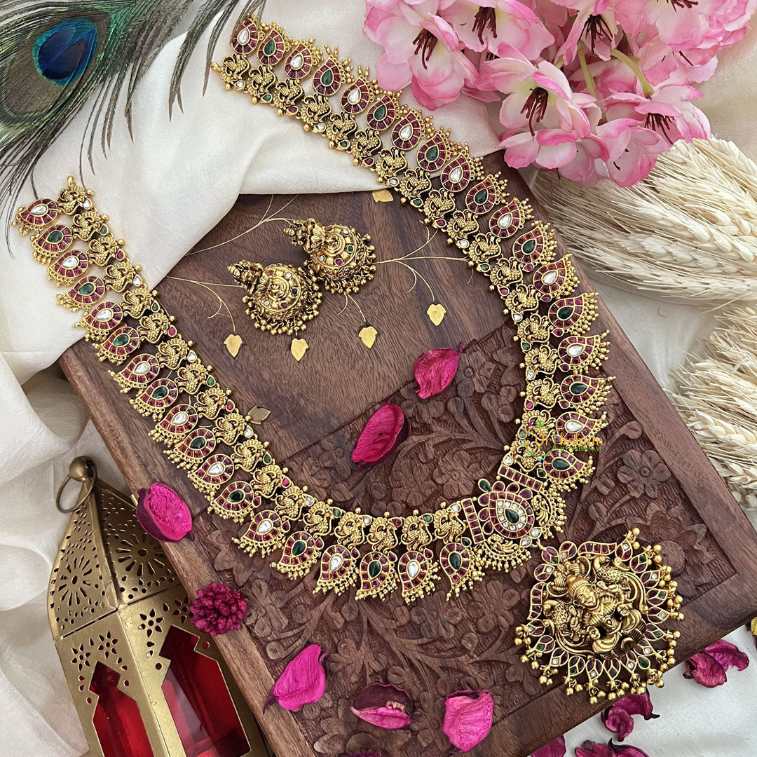 Indulge in elegance with our Vriksham Lakshmi Pendant Kemp Stone Maanga Long Neckpiece. The beautifully crafted pendant, adorned with delicate Kemp stones and a gold bead, exudes a sense of sophistication and exclusivity. Elevate your style and add a touch of luxury to any outfit with this one-of-a-kind piece.