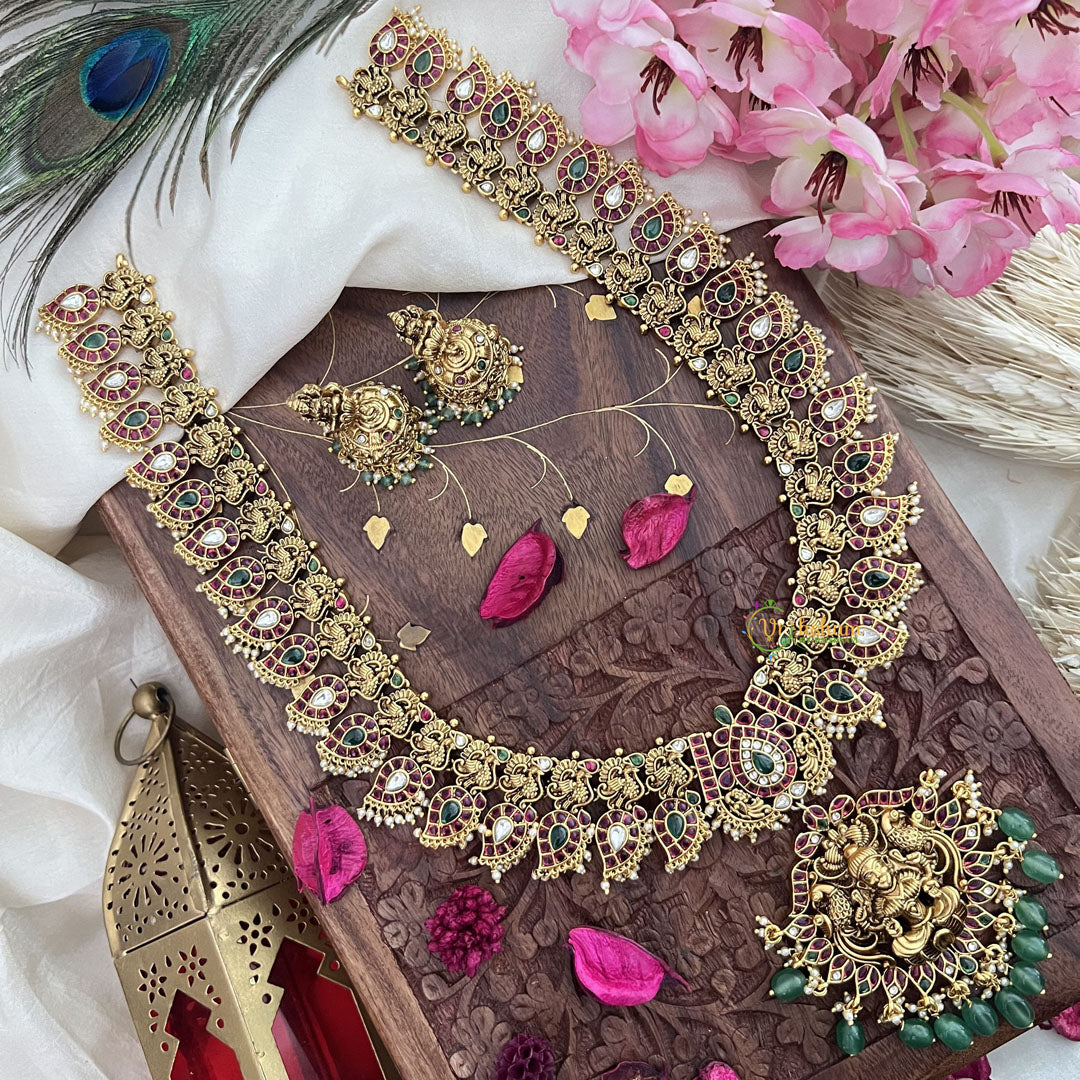 Indulge in elegance with our Vriksham Lakshmi Pendant Kemp Stone Maanga Long Neckpiece. The beautifully crafted pendant, adorned with delicate Kemp stones and a pastel green bead, exudes a sense of sophistication and exclusivity. Elevate your style and add a touch of luxury to any outfit with this one-of-a-kind piece.
