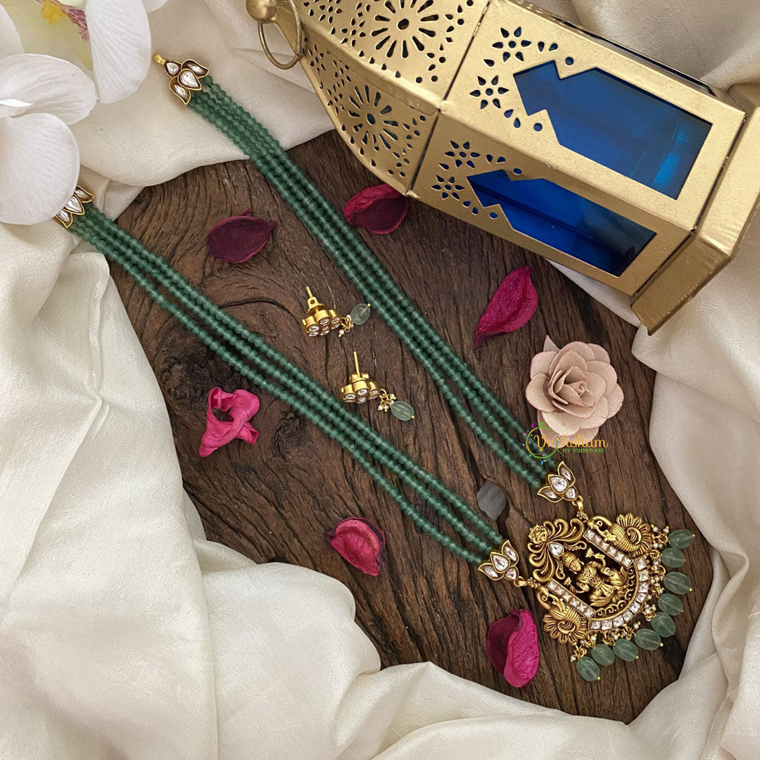 Indulge in the luxury of the Vriksham Lakshmi Pendant Kundan Jadau Pastel Green Beaded Mala-White-Lotus. Adorn yourself with this elegant piece, featuring a Kundan Jadau pendant and pastel green beads delicately strung together to create a statement accessory. Get this exclusive mala for a touch of sophistication in your wardrobe.