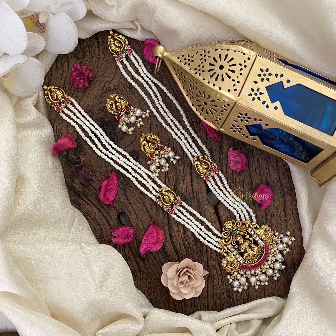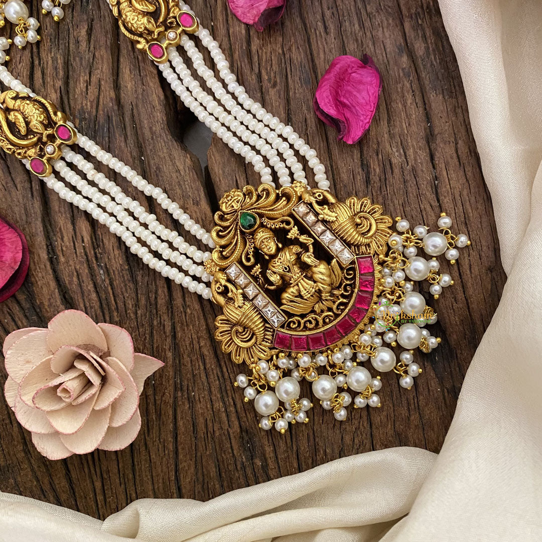 Elevate your style with the Vriksham Lakshmi Pendant Kundan Jadau White Beaded Mala. Crafted with intricate Kundan Jadau detailing and white beads, this pendant exudes luxury and sophistication. Embody the grace and beauty of the goddess Lakshmi with this exclusive piece.