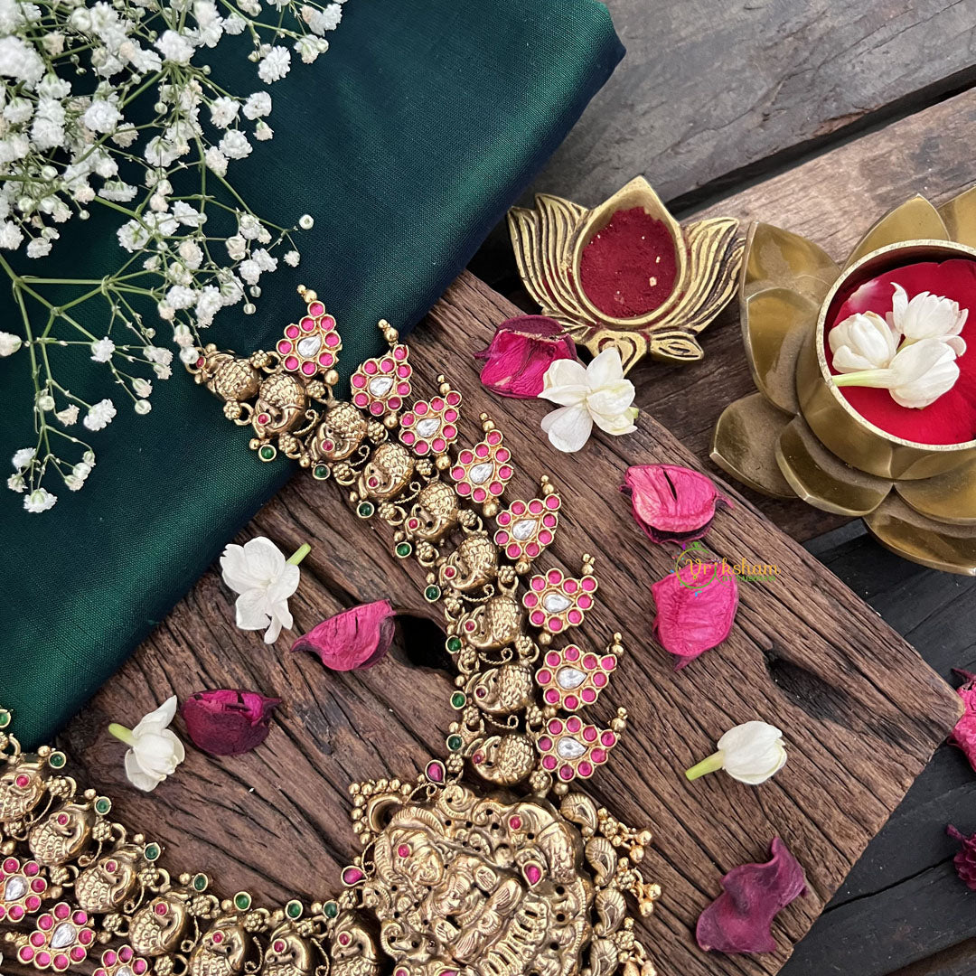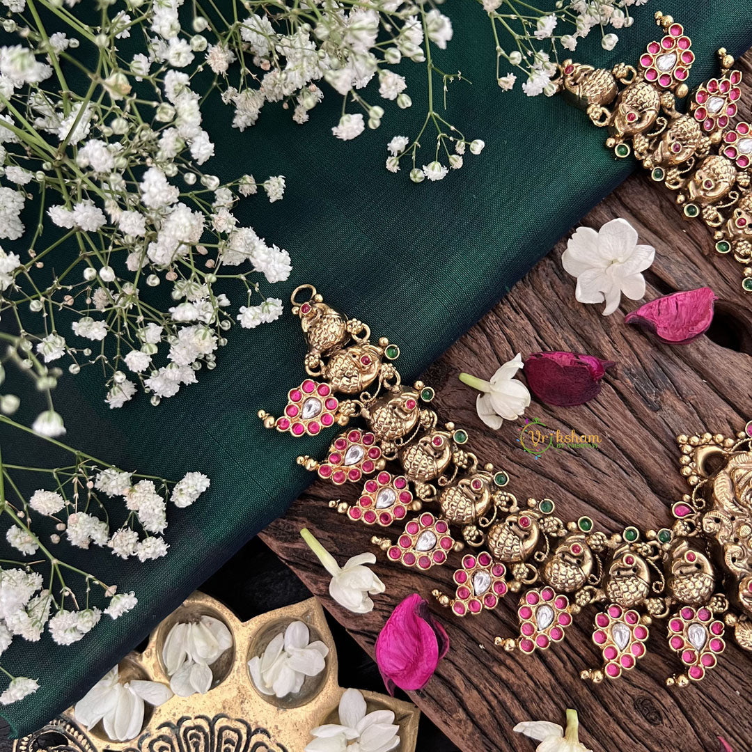 Unleash your inner goddess with Vriksham's Lakshmi Pendant. Adorned with a stunning peacock design and crafted from 1 gm of gold, this short neckpiece exudes elegance and luxury. Let it be a symbol of prosperity and beauty in your collection.