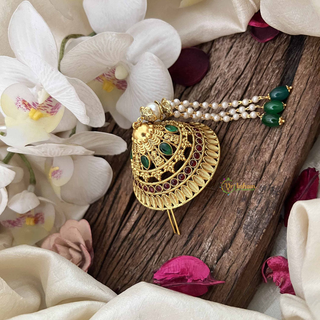 Experience the refined beauty of the Lakshmi Tamil Iyengar Andal Kondai, featuring a luxurious blend of golden, red, and green tones adorned with shimmering pearls. This meticulously crafted accessory embodies traditional elegance, perfect for enhancing classical attire during festive and sacred occasions. Its sophisticated design brings a graceful and authentic touch to your ensemble.
