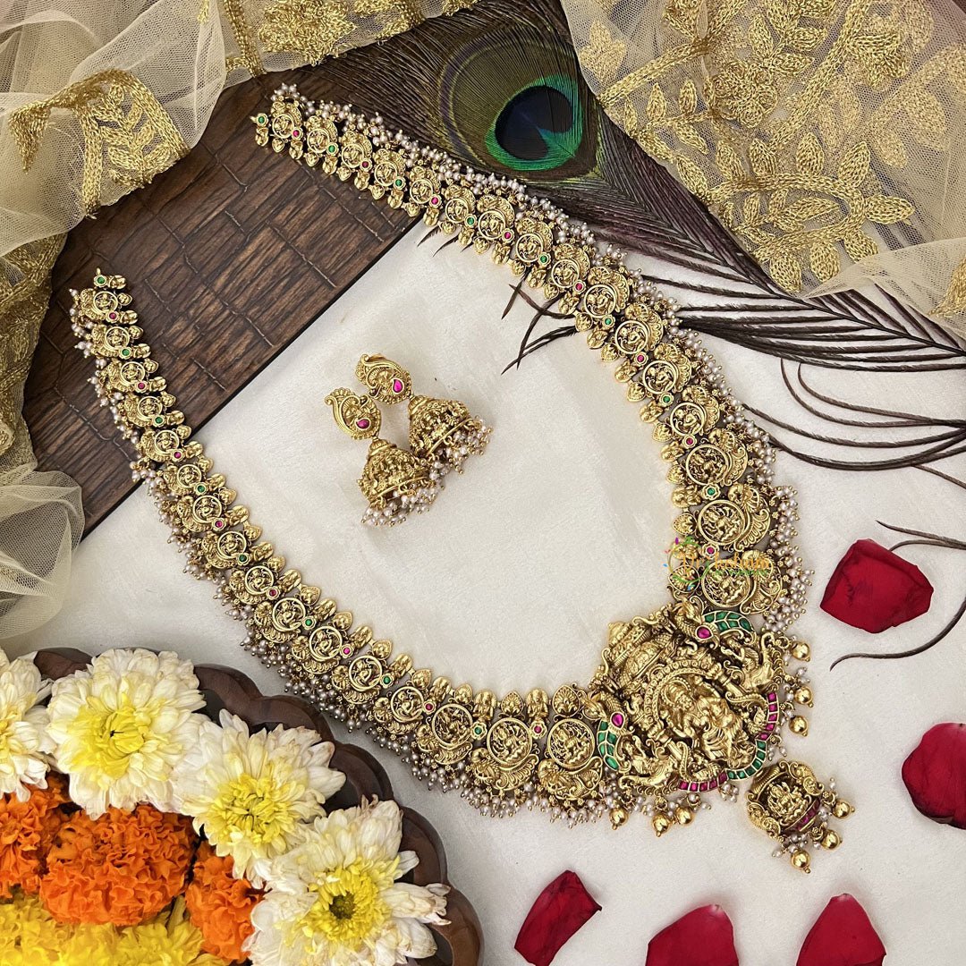 The Vriksham Lakshmi Temple Heritage necklace features a beautifully rounded design paired with lustrous pearls. This sophisticated piece blends traditional artistry with timeless elegance, making it a perfect accessory to elevate your festive and ceremonial attire with grace and refinement.