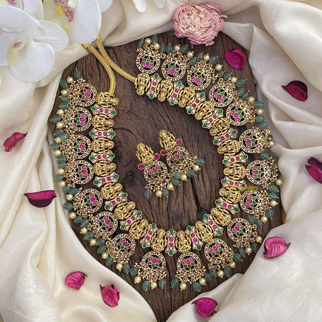 Indulge in pure luxury with our Vriksham Lakshmi necklace. Crafted with intricate Jadau and Kundan techniques, this piece features a stunning Lakshmi pendant and delicate coin and lotus detailing. Complete the look with our matching earrings. Elevate your style with this exclusive, statement necklace.
