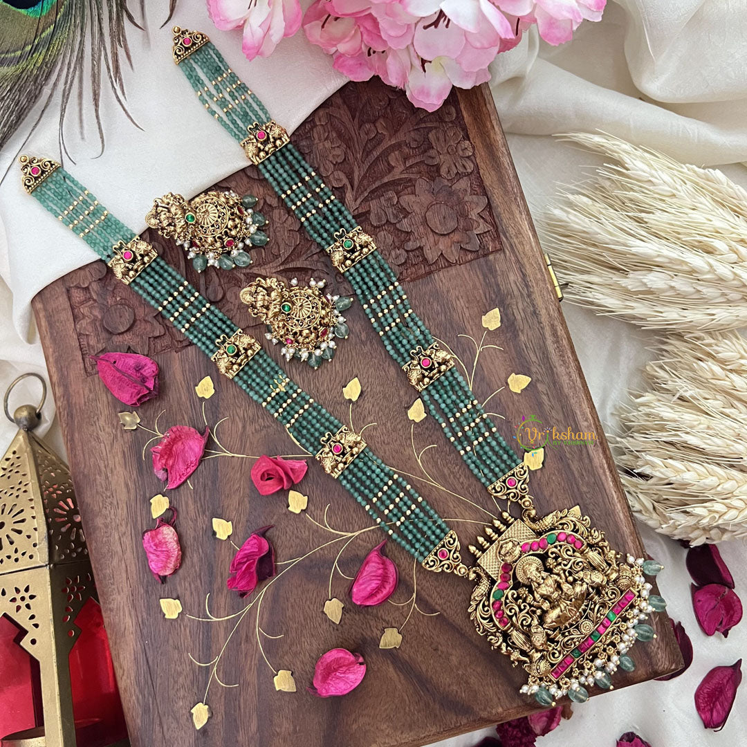 Indulge in opulence with Vriksham's Lakshmi necklace, featuring a dual elephant pendant adorned with vibrant green and pastel beads. This red haram exudes sophistication and grace, perfect for elevating any ensemble to luxurious heights.