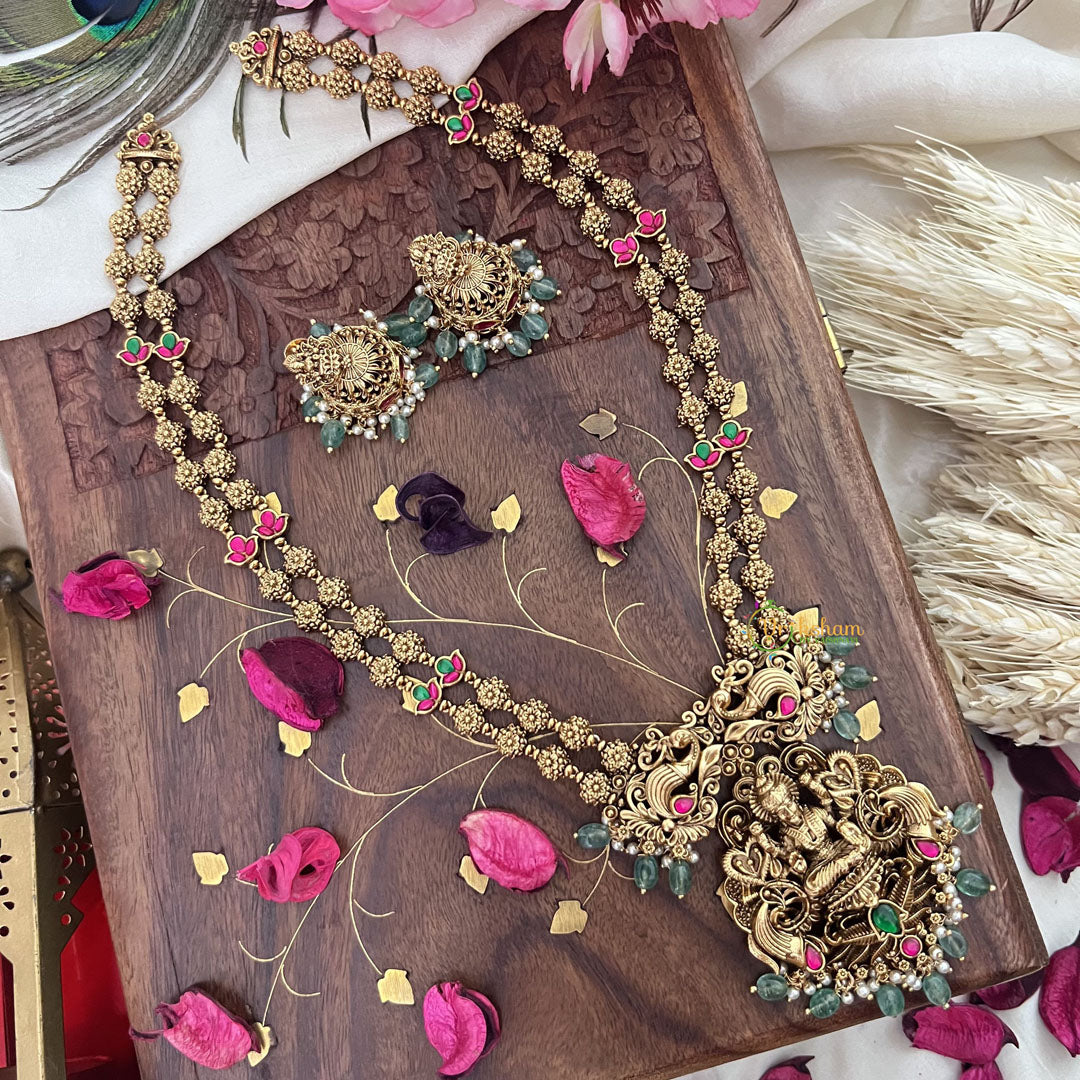 Experience elegance and luxury with our Vriksham Lakshmi dual peacock necklace. Handcrafted with red and green beads, this 2 layered necklace is a symbol of prosperity and beauty. Add a touch of art and fashion to your look with this exclusive piece.