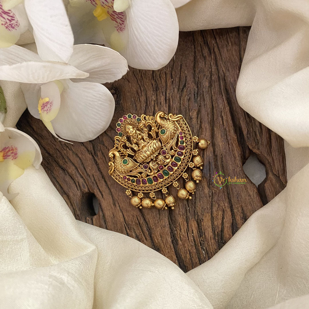Indulge in luxury and radiate elegance with our Vriksham Lakshmi Bun Billai. Designed with dual peacocks and adorned with exquisite red green and gold beads, this piece is a delicate and sophisticated addition to any outfit. Experience the beauty and opulence of this handcrafted accessory.