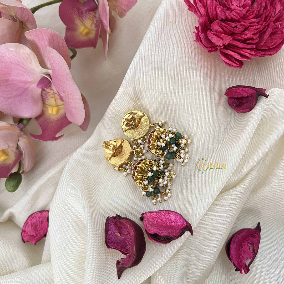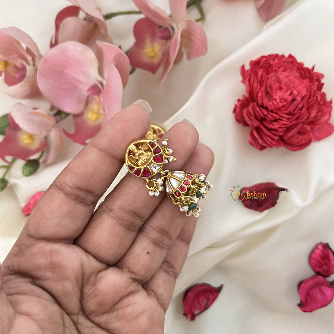 The Vriksham Lakshmi With Half Moon Style Kundan Jadau Jhumkas combine intricate kundan craftsmanship with symbolic Lakshmi motifs and elegant half-moon designs. Accented by red, white, and green beads, these jhumkas embody a blend of tradition and sophistication, perfect for elevating your festive or formal ensemble with timeless grace.