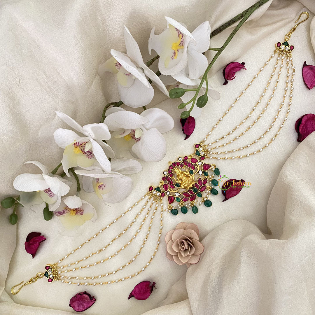 Vriksham Lakshmi With Lotus Kundan Jadau Sheeshphool-Red Green-Green Bead-J2777