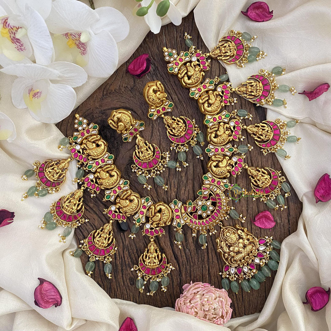 Indulge in luxury with Vriksham's Lakshmi and Peacock Jadau Kundan Short Neckpiece. Adorned with intricate details and complemented by matching earrings, this piece exudes sophistication and exclusivity. Elevate your style and make a statement with this exquisite neckpiece.