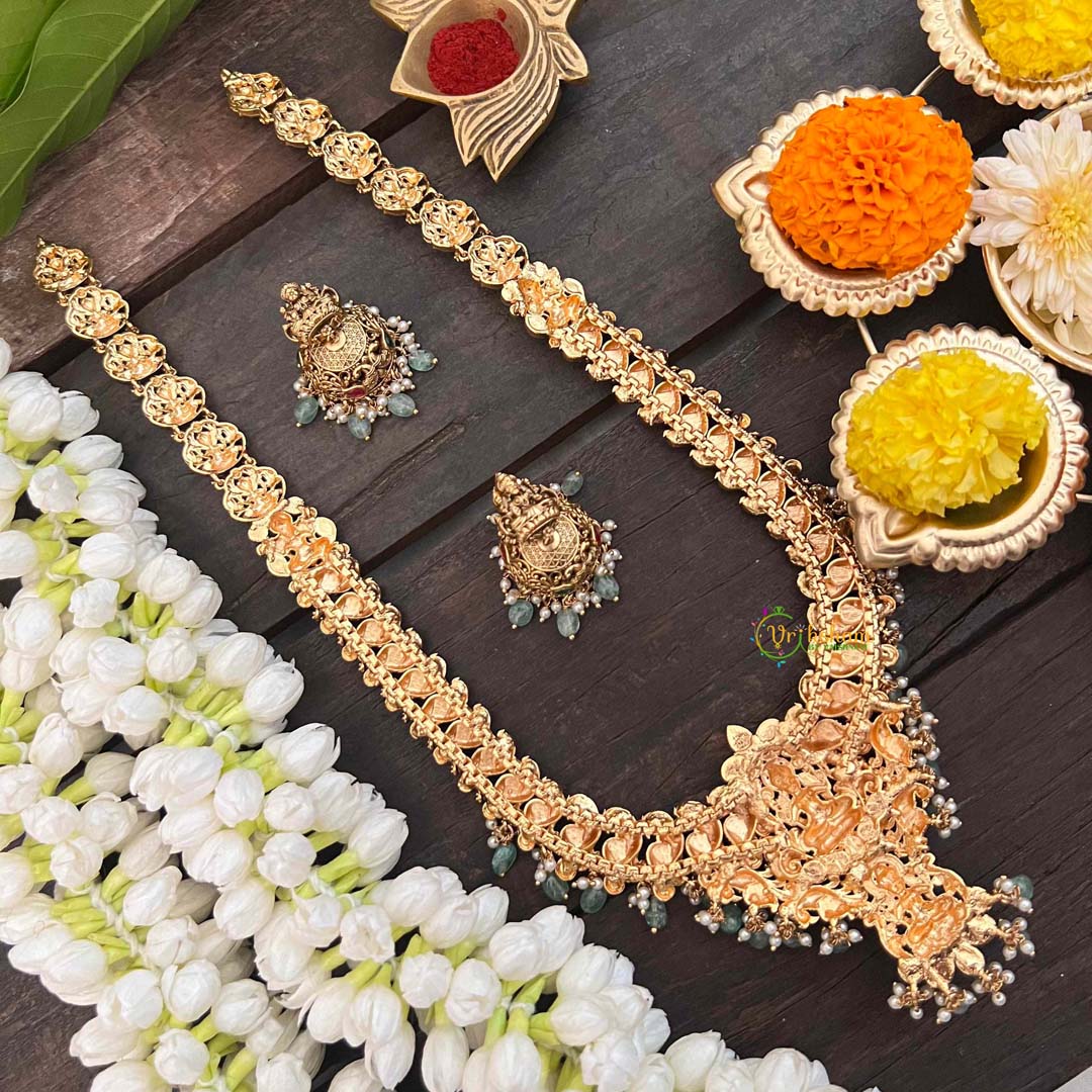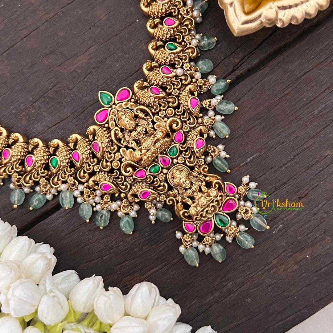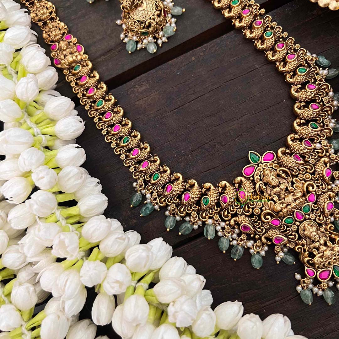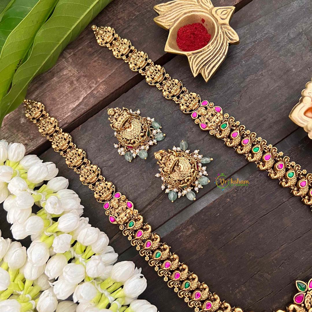 Elevate your style with Vriksham's Lakshmi and Peacock Long Neckpiece. Adorned with kundan stones, pastel green beads, and pearls, this piece exudes sophistication. Make a statement with this luxurious and exclusive accessory.