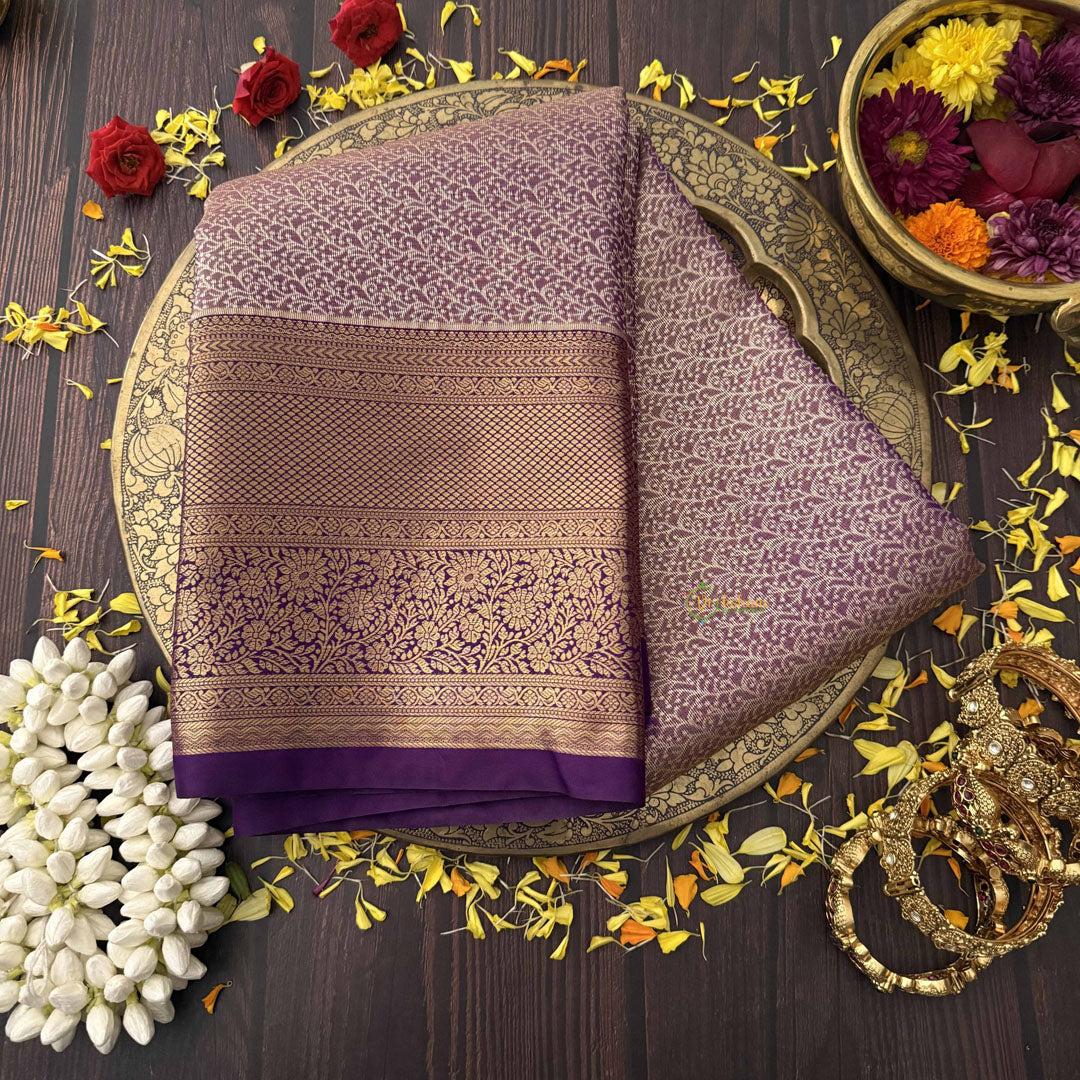 The Vriksham Lavender Kanchi Silk Saree showcases a serene lavender shade adorned with intricate purple-gold full brocade work. Crafted from premium silk, this saree offers a luxurious texture and elegant drape, making it an ideal choice for refined celebrations. Its sophisticated design beautifully blends traditional artistry with contemporary charm.