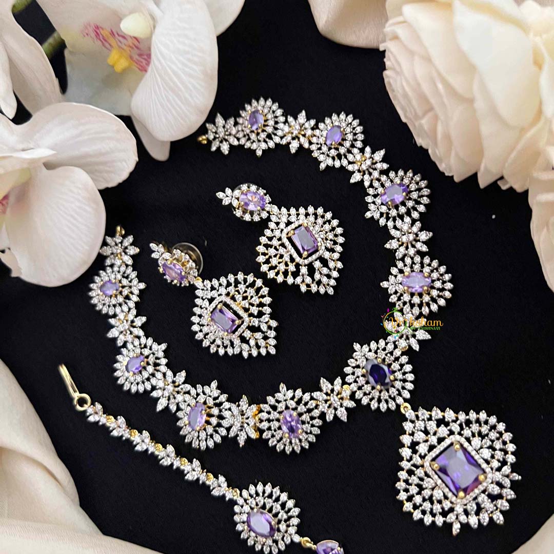 Elevate your jewelry collection with this exquisite 3-piece set featuring a striking rectangular statement pendant adorned with lustrous purple stones and sparkling American diamonds. The sophisticated design combines timeless elegance with contemporary flair, making it perfect for both special occasions and elevated everyday wear. This versatile ensemble includes coordinating pieces that work seamlessly together, allowing you to create a cohesive, polished look. The premium craftsmanship and radiant gemstone detailing ensure you'll make a memorable impression wherever you go.