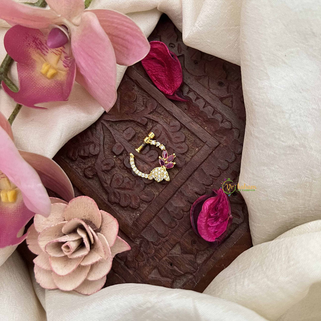 The Vriksham Leaf & Diya Style Press Naths in red and white showcases an elegant fusion of leaf and diya motifs. Designed for a secure and comfortable press fit, this nose pin adds a graceful blend of colors, enhancing both traditional and contemporary looks with subtle sophistication.