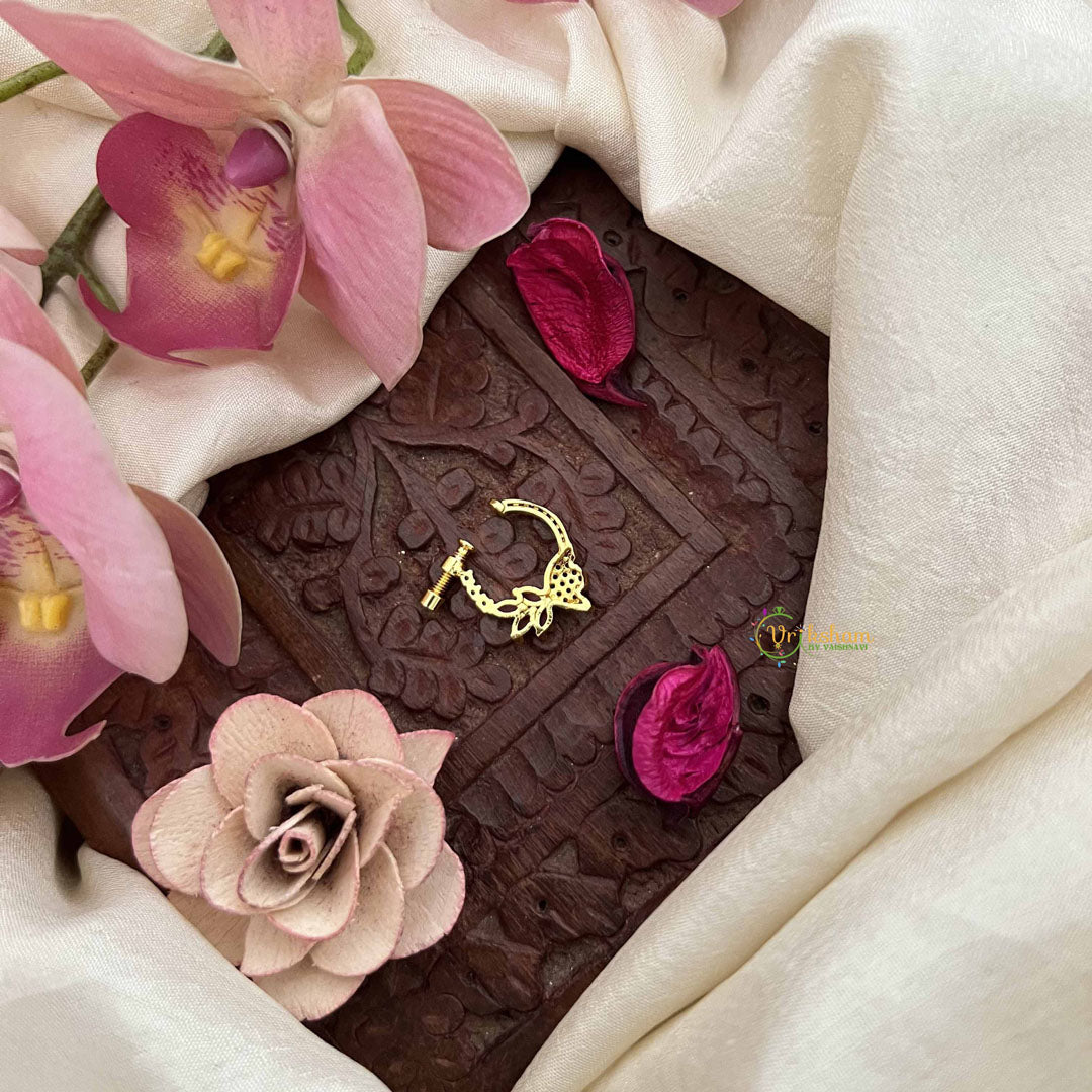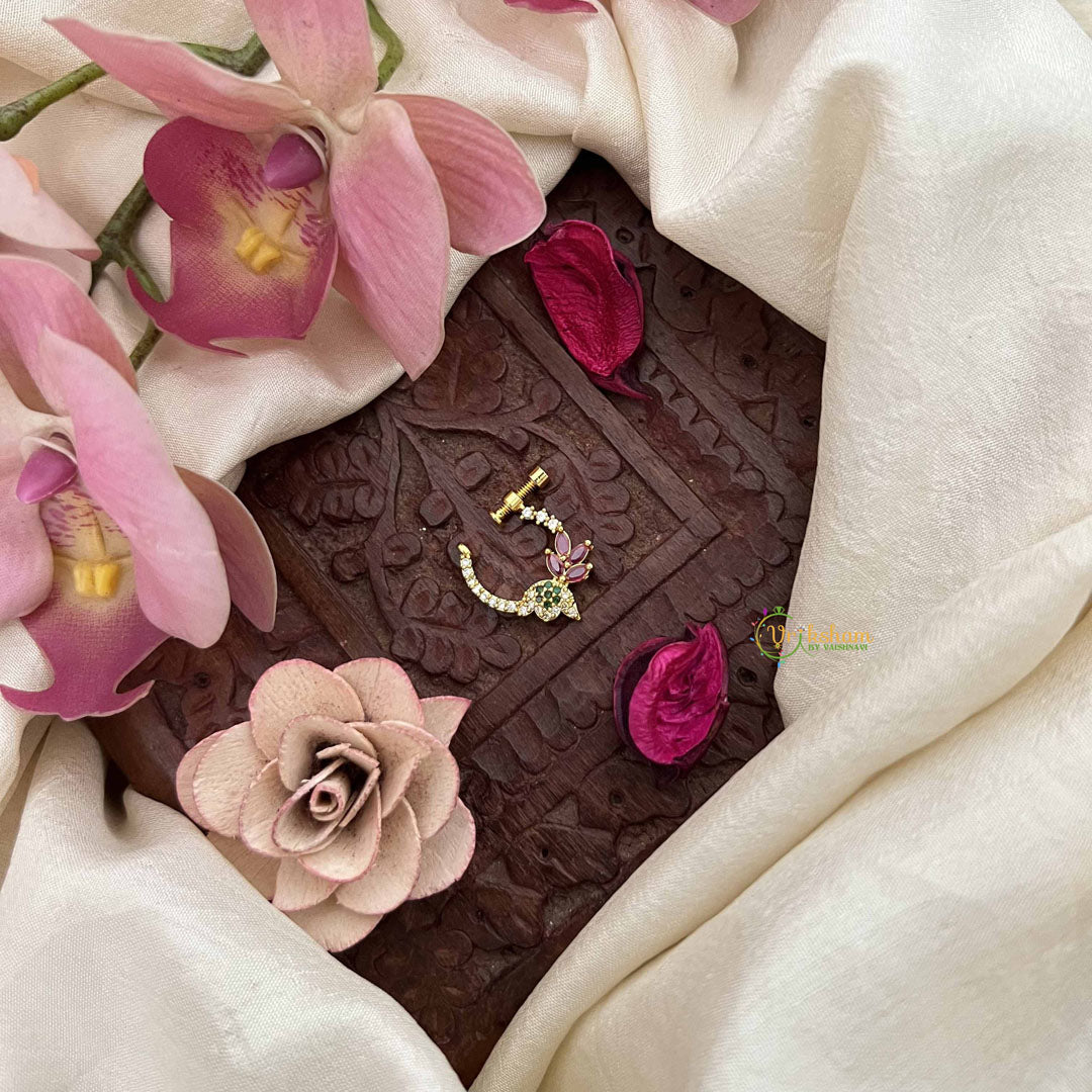The Vriksham Leaf & Diya Style Press Naths in red, white, and green beautifully combines nature-inspired leaf and diya motifs. Crafted for a secure and comfortable press fit, this nose pin brings a harmonious blend of vibrant colors and elegant design, perfect for adding a refined accent to both traditional and contemporary styles.